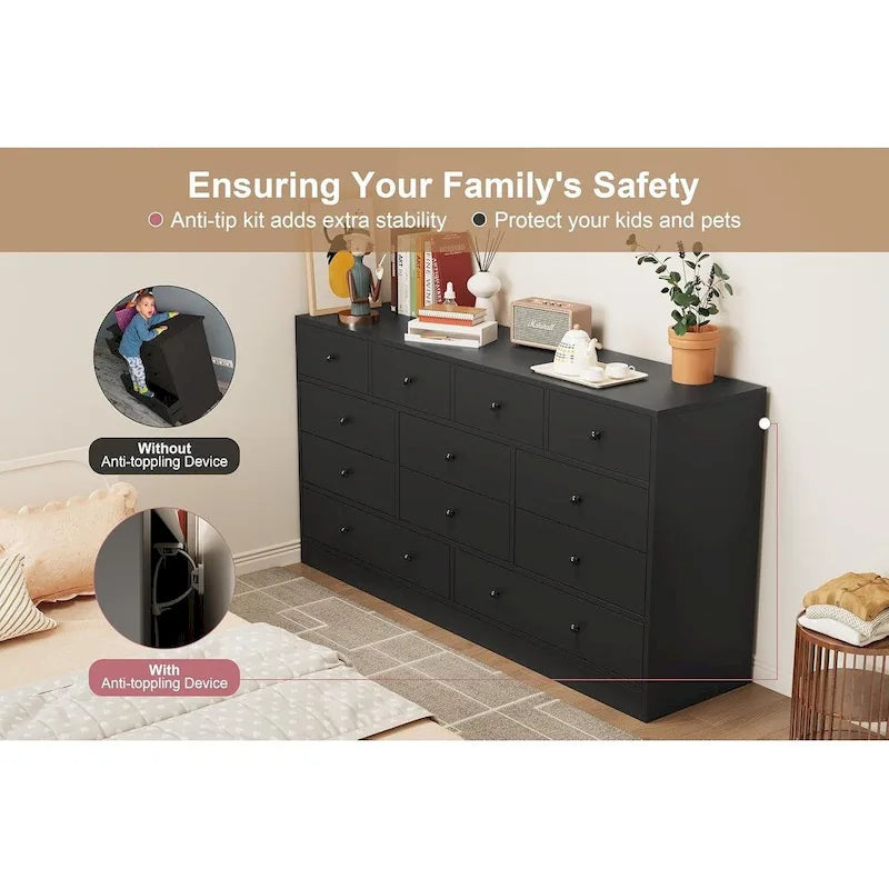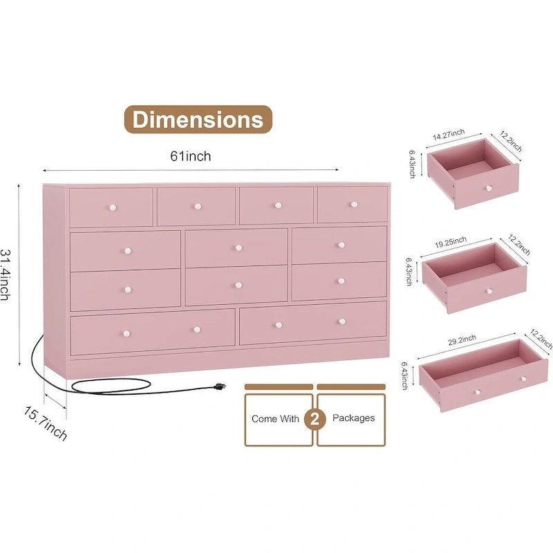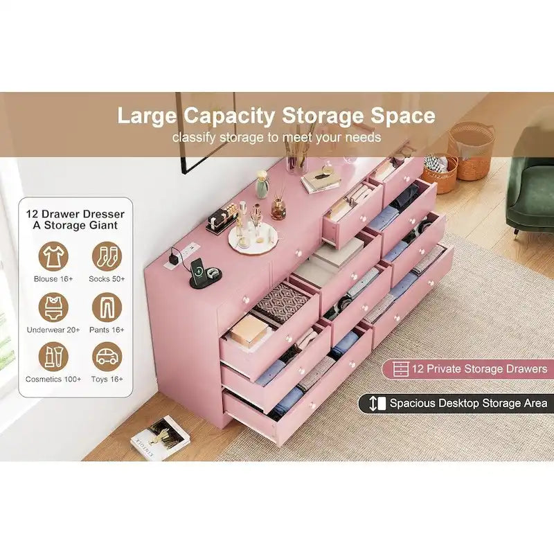Commode à 12 tiroirs pour chambre à coucher, commode en bois de 155 cm avec prise électrique