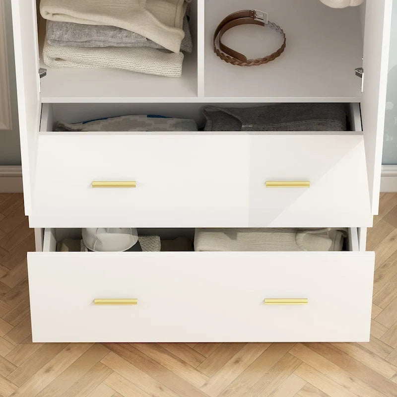 Cette armoire vous offre une solution de rangement complète pour tous vos vêtements ! Elle dispose de deux grands tiroirs en bas pour les vêtements chauds, et de quatre compartiments intérieurs séparés par des étagères pour les vêtements que vous préférez plier (ou pour y placer des paniers). Une tringle permet d'accrocher vos chemises sur des cintres. Chaque pièce de votre garde-robe trouvera sa place.