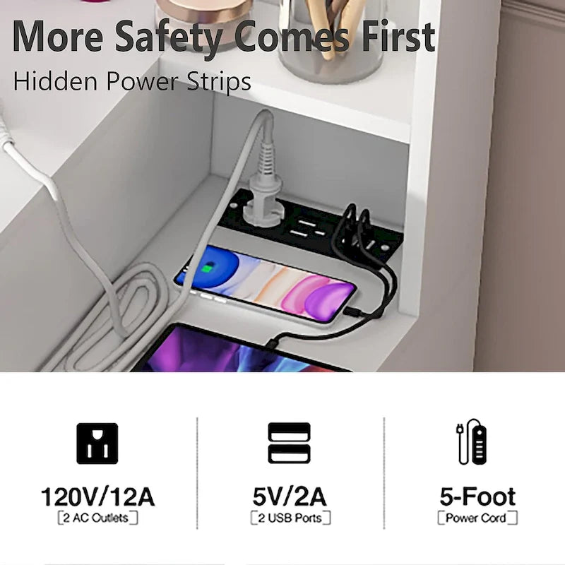 - Ensemble coiffeuse avec ports USB et prises électriques. Pour éviter de débrancher et rebrancher constamment la prise, la coiffeuse PAKASEPT est équipée d'une alimentation intégrée comprenant 2 ports USB et 2 prises électriques. Elle permet de recharger votre téléphone portable tout en utilisant un sèche-cheveux ou un fer à friser pour un maquillage impeccable. Elle peut également recharger des humidificateurs, des lampes de bureau et autres petits appareils électriques, pour un quotidien plus pratique et confortable.