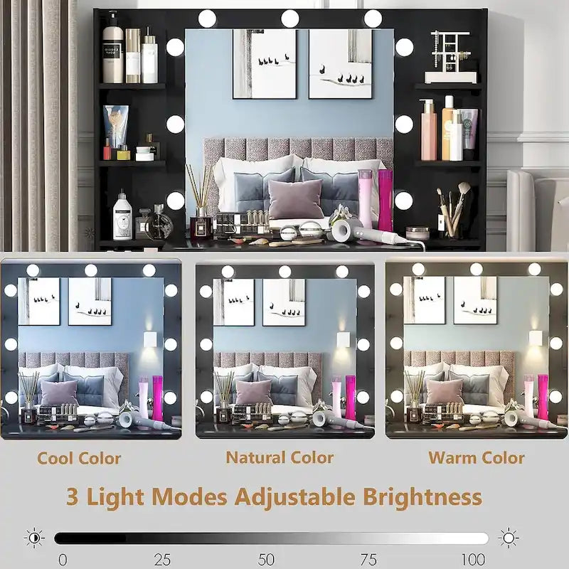 - Miroir de coiffeuse avec lumières (SANS TABOURET) La coiffeuse est équipée de 9 lumières LED et d'un grand miroir qui peuvent être éclairés de jour comme de nuit, vous offrant une lumière douce pour que vous puissiez vous admirer sous votre meilleur jour, aussi belle qu'une star.