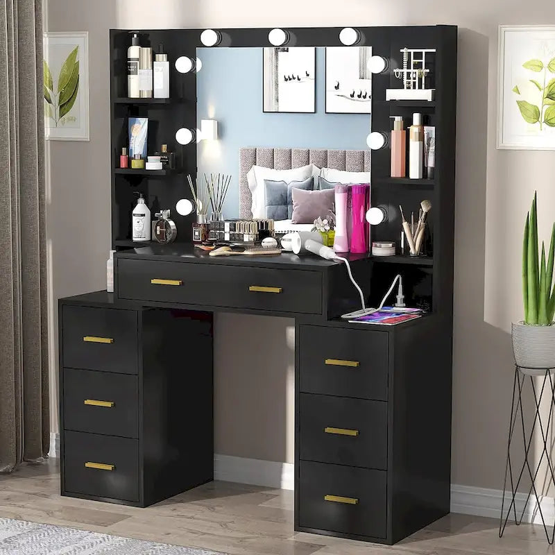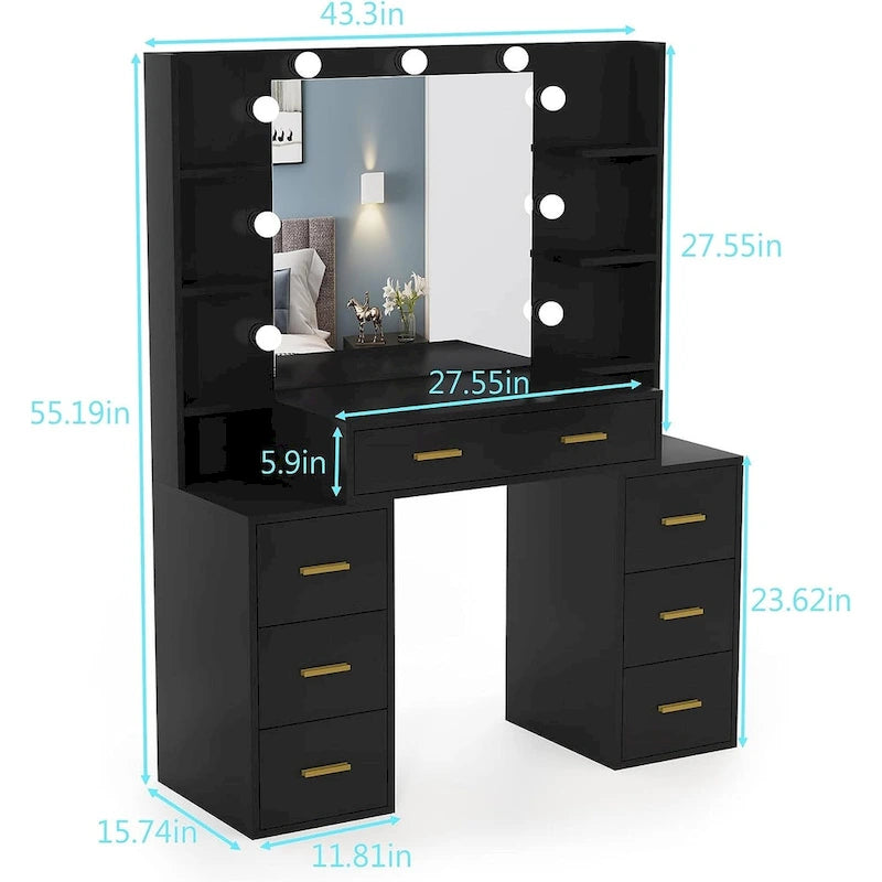 Coiffeuse 43 avec éclairage 3 couleurs, station de recharge, étagères de rangement et 7 tiroirs