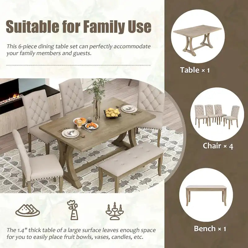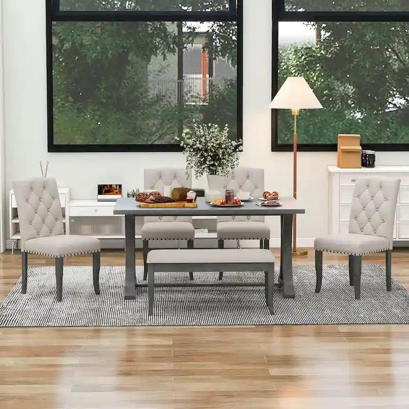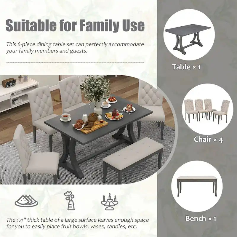 Ensemble de salle à manger de style campagnard 6 pièces, comprenant une table rectangulaire à tréteaux, 4 chaises rembourrées et un banc.