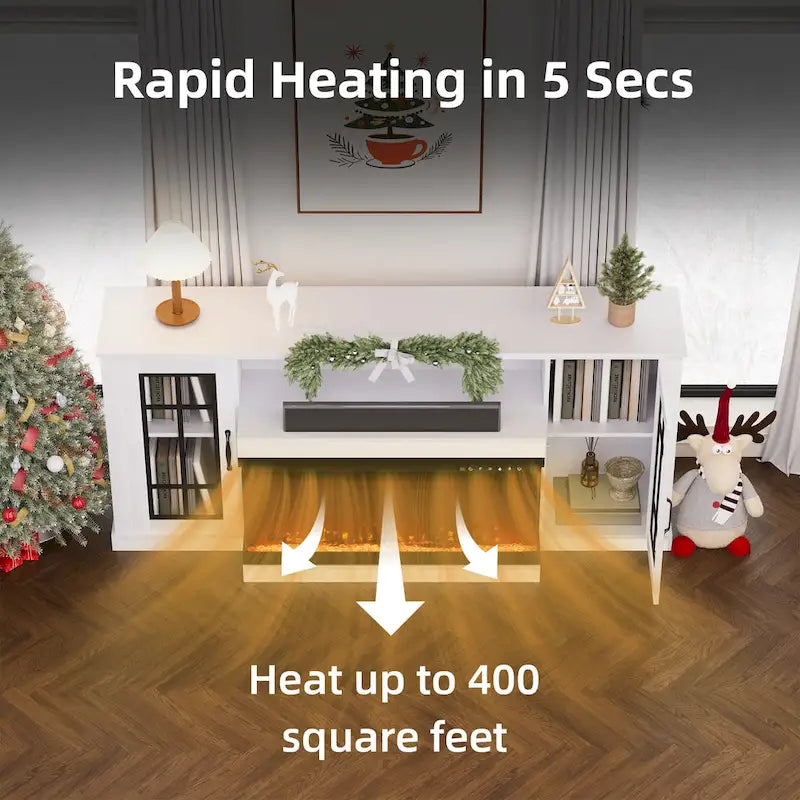 Sublimez votre espace de divertissement avec ce meuble TV cheminée de 178 cm (70 pouces), conçu pour accueillir des téléviseurs jusqu'à 203 cm (80 pouces), alliant harmonieusement esthétique et fonctionnalité. Son atout majeur : une cheminée électrique vitrée de 91 cm (36 pouces) offrant une vue panoramique à 360° sur des flammes vibrantes, quel que soit votre angle de vue. Fournie avec des bûches et des cristaux, cette cheminée offre une expérience de feu réaliste et propose 12 options de couleurs. Certifiée ETL et équipée d'un système de protection contre la surchauffe, elle garantit la sécurité de tous les utilisateurs, ce qui en fait le choix idéal pour les pièces à vivre où la sécurité est primordiale. Son chauffage de 1 500 W chauffe efficacement une surface allant jusqu'à 37 m² (400 pieds carrés), assurant une ambiance chaleureuse. Fabriqué en bois mat imperméable de qualité E1, le meuble peut supporter jusqu'à 136 kg (300 livres), garantissant durabilité et stabilité. Si vous recherchez un meuble TV cheminée élégant, écoénergétique, offrant un grand espace de rangement et une grande multifonctionnalité, ce modèle répondra à toutes vos attentes.