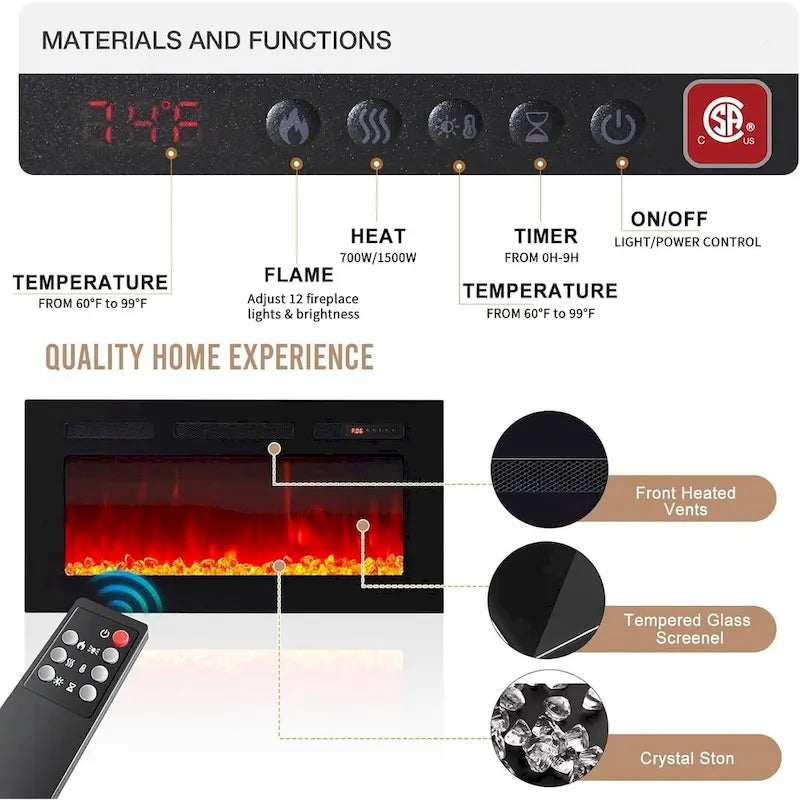 Cheminée électrique high-tech : Profitez d'effets de flamme 3D réalistes et de bûches incandescentes grâce à notre cheminée électrique. Elle vous apporte de la chaleur sans les inconvénients de la poussière, du bois de chauffage ou de la fumée. Choisissez parmi 12 couleurs de LED et 5 niveaux de luminosité des flammes. La température est réglable de 17 °C à 28 °C et vous pouvez programmer une minuterie de 1 à 8 heures.