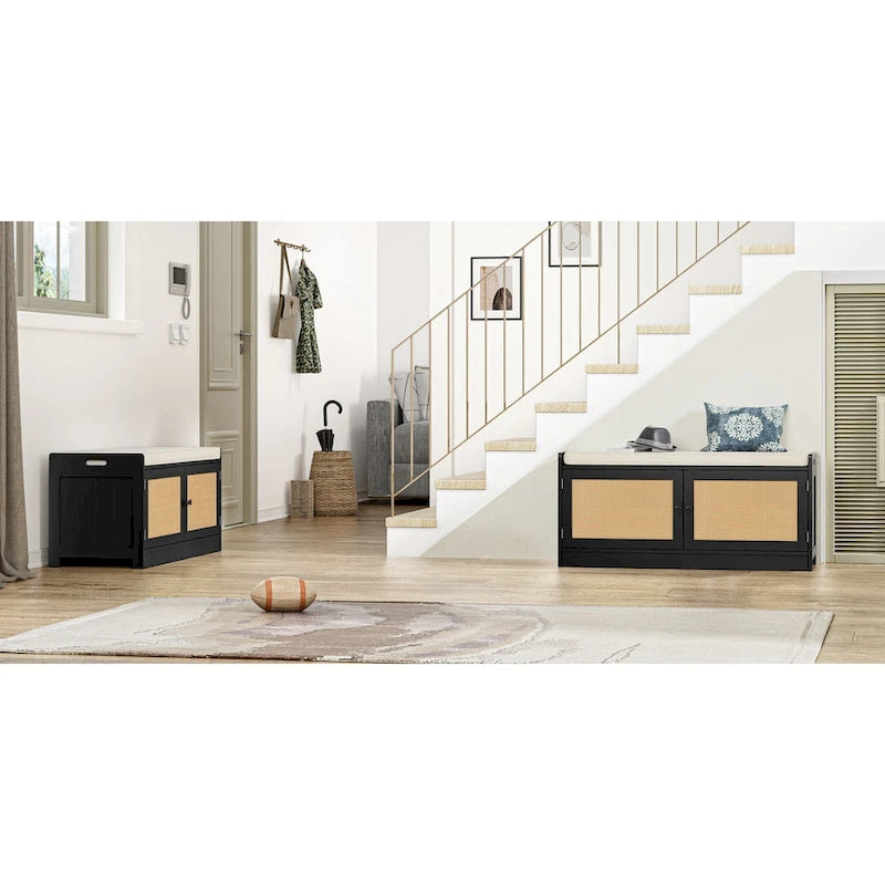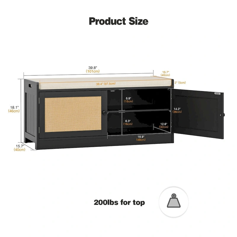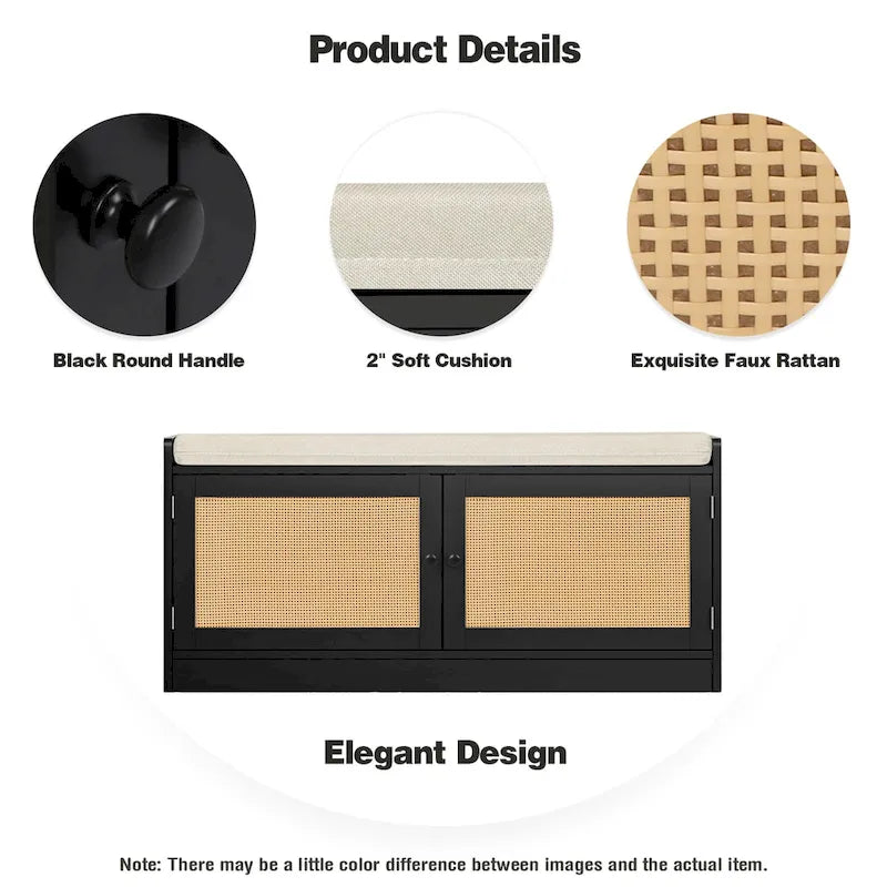 Banc de rangement à chaussures moderne Anmytek en bois et rotin avec coussin et étagères réglables pour entrée - 39,8 cm (L) x 15,7 cm (P) x 18,1 cm (H)