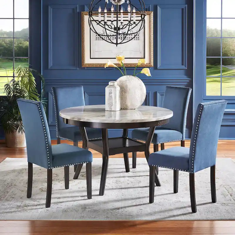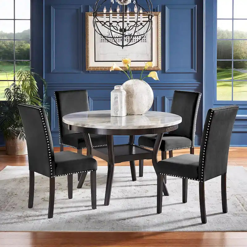 Apportez une touche d'élégance à votre intérieur avec cette table à manger de 122 cm (48 pouces) dotée d'un plateau rond en faux marbre blanc. Ses lignes épurées et son design simple et raffiné mettent en valeur son plateau arrondi en faux marbre gris et blanc, soutenu par de superbes pieds en bois massif. Sa construction robuste garantit solidité et stabilité, idéale pour recevoir des invités ou partager des repas en famille. Une étagère ouverte offre un espace de rangement supplémentaire ou peut servir de repose-pieds pour plus de confort. Les chaises d'accompagnement, revêtues d'un velours doux et ornées de clous décoratifs, offrent un style luxueux et vintage. Rembourrées de mousse haute densité, fabriquées en bois d'hévéa massif et finies couleur espresso, elles constituent un choix confortable et robuste pour la salle à manger, le salon, la salle de séjour ou le bureau.