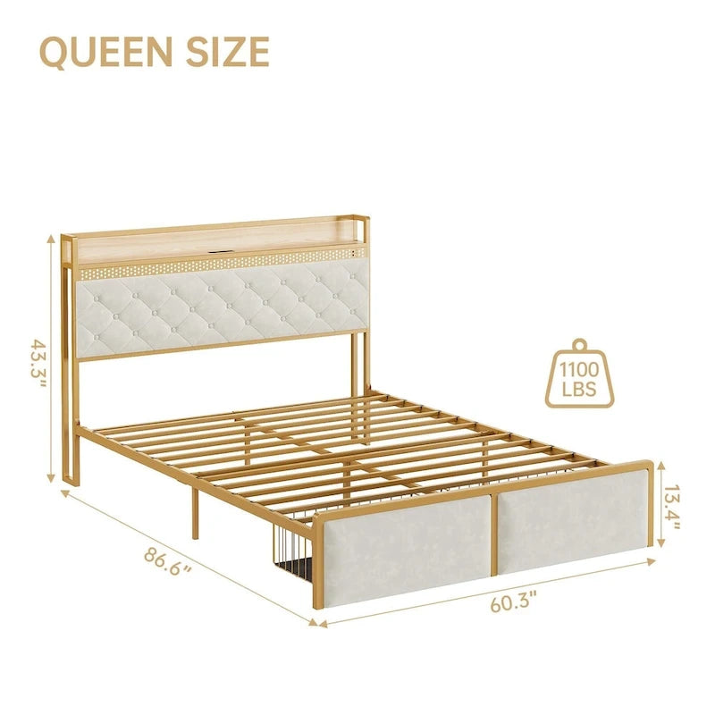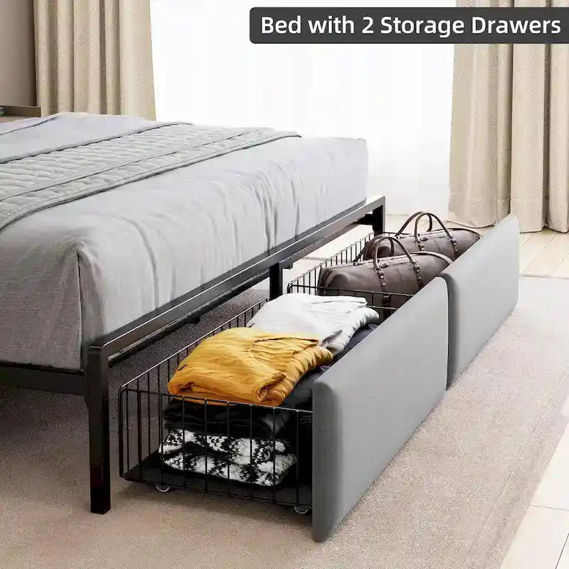 Espace de rangement multifonctionnel : deux grands tiroirs de rangement sous le sommier, avec tapis anti-poussière noirs, facilitent le rangement et l’organisation des vêtements. La tête de lit à deux niveaux offre un espace de rangement pratique pour les objets du quotidien tels que magazines, téléphone, réveil, etc., optimisant ainsi l’espace de la chambre.