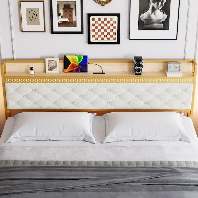 Cadre de lit double avec tête de lit - La tête de lit rembourrée est dotée d'une station de charge intégrée, comprenant 2 prises standard et 2 ports USB, vous permettant de recharger divers appareils électroniques à portée de main. Elle est également recouverte d'un tissu très élastique pour offrir un soutien optimal à votre dos.