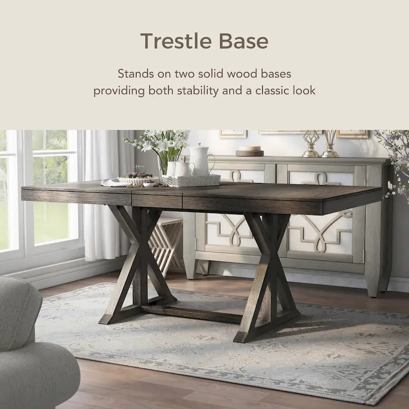 Appréciez le charme champêtre de cette table à manger rectangulaire en bois. Son élégant piètement de style campagnard, évoquant un tréteau, et ses tons gris naturels ajoutent une touche de sophistication à l'esprit rustique.