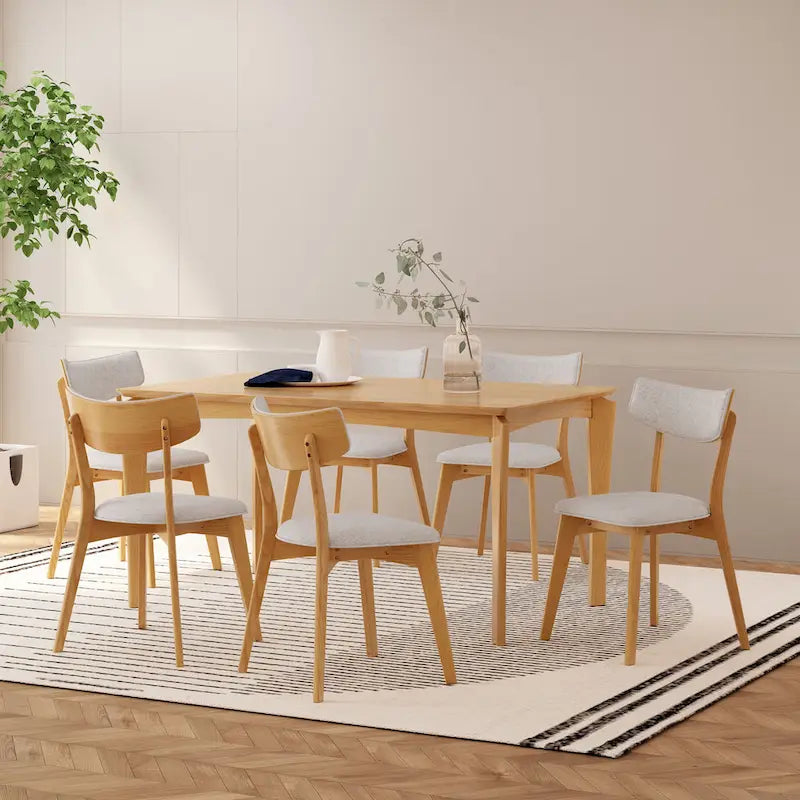 Créez une ambiance impressionnante dans votre salle à manger tout en profitant d'un confort optimal à chaque repas grâce à cet ensemble de salle à manger moderne et élégant, inspiré du style mid-century. Avec ses pieds fuselés stylés, ses chaises rembourrées à dossier ajouré et ses finitions en bois chaleureux, notre ensemble vous offre tout ce dont vous rêvez pour votre salle à manger. Avec ses six places assises, savourez chaque repas avec style.