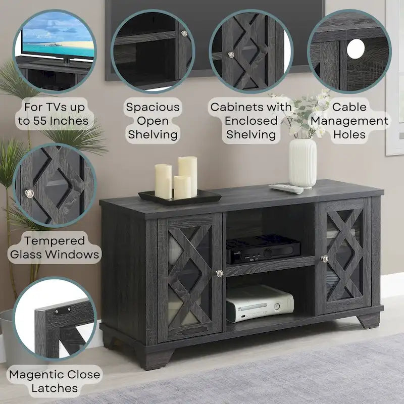 Le meuble TV Gateway de Convenience Concepts, avec ses rangements et ses étagères, allie style moderne et intemporel, ce qui en fait le centre multimédia idéal pour votre salon. Conçu pour accueillir des téléviseurs jusqu'à 55 pouces, ce meuble offre un design élégant qui s'intègre harmonieusement à tous les décors. Fabriqué en bois composite durable avec une superbe finition veinée, il dispose de deux étagères ouvertes et de quatre placards fermés, offrant un espace de rangement généreux pour vos consoles de jeux, lecteurs multimédias et objets décoratifs. Les portes des placards, ornées d'un élégant double X et de vitres en verre trempé, se ferment facilement grâce à des fermetures magnétiques. Des passe-câbles garantissent un espace TV organisé et dégagé. Améliorez votre expérience de divertissement à domicile avec le meuble TV Gateway de Convenience Concepts, à la fois élégant et pratique.