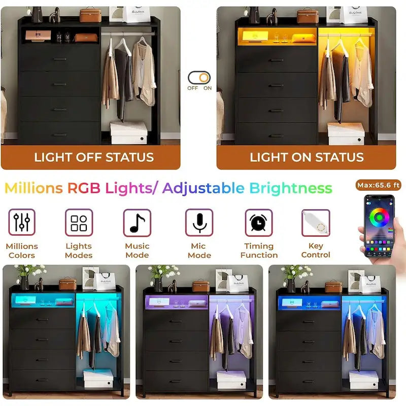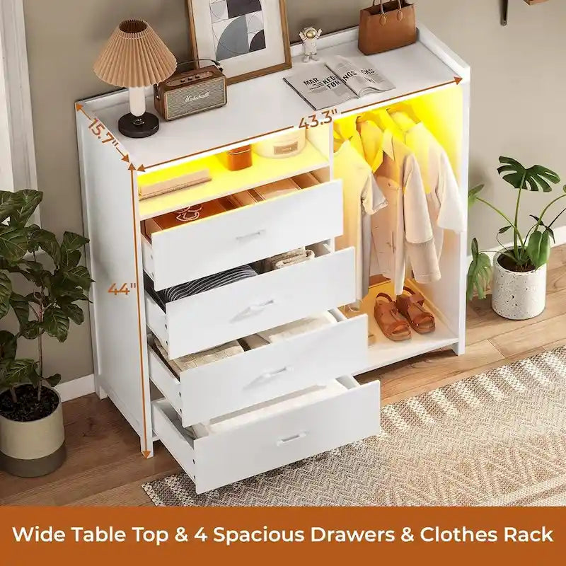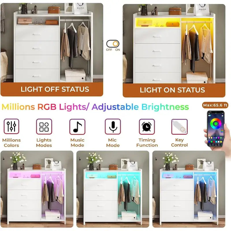 Commode pour chambre à coucher avec penderie, commodes et chiffonniers, commode à 4 tiroirs avec éclairage LED