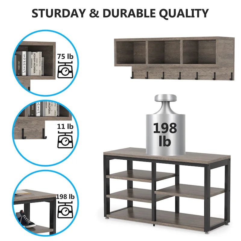 - Banc à chaussures multifonctionnel 5 en 1 avec 7 crochets, 3 compartiments de rangement, une étagère supérieure, un range-chaussures à 3 niveaux et un banc à chaussures.