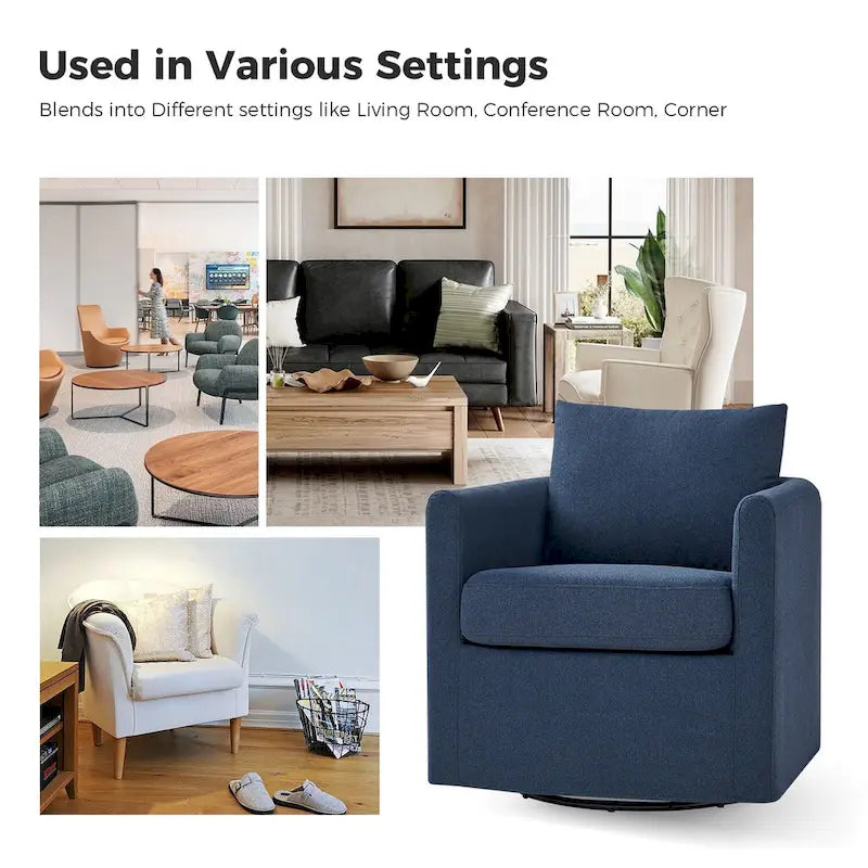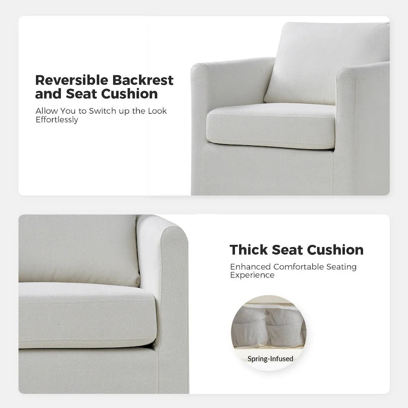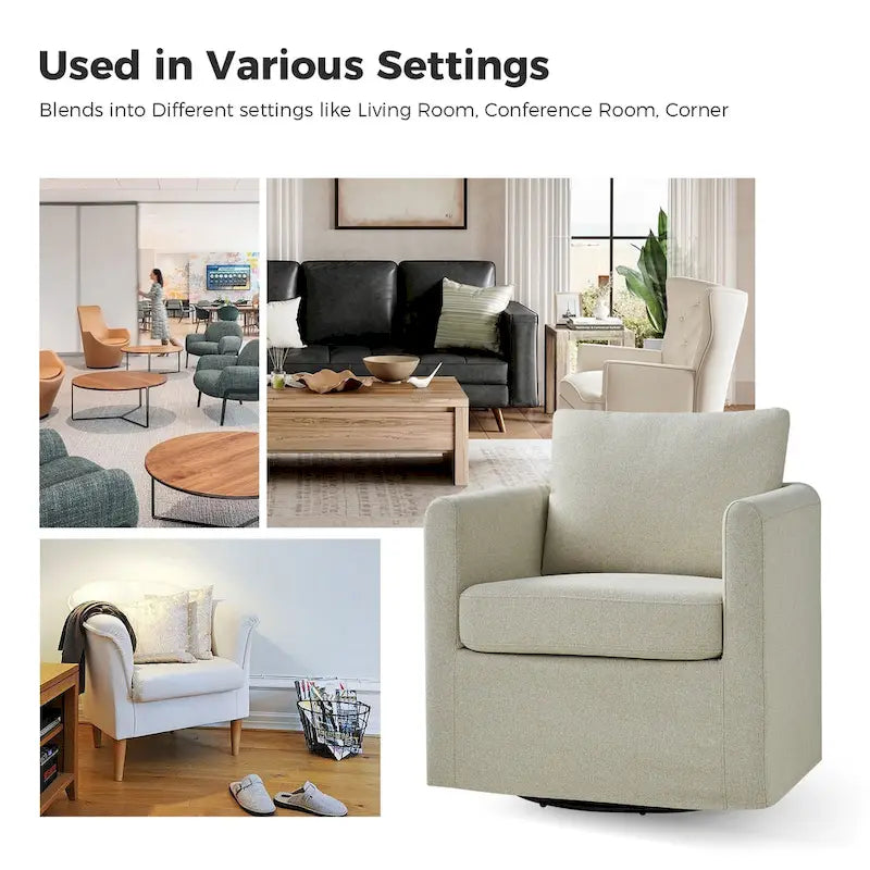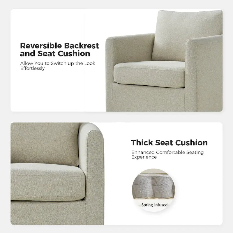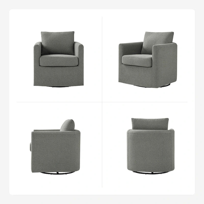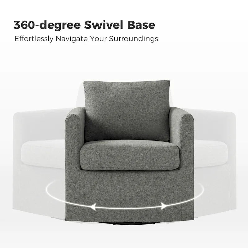 Conçu pour le salon et la chambre, ce fauteuil pivotant moderne allie harmonieusement fonctionnalité et esthétique. Grâce à son piètement pivotant innovant à 360°, vous vous déplacez avec aisance. La housse, confectionnée dans un tissu doux au toucher imitant la texture du lin, est élégante et amovible pour un lavage facile. Profitez de la double fonctionnalité des coussins de dossier et d'assise amovibles : retournez-les en un clin d'œil pour un style renouvelé et un entretien aisé. Le tissu à la texture lin offre un support confortable pour vos bras. Sublimez votre intérieur avec ce fauteuil pivotant chic et polyvalent, où design contemporain et praticité se conjuguent harmonieusement.