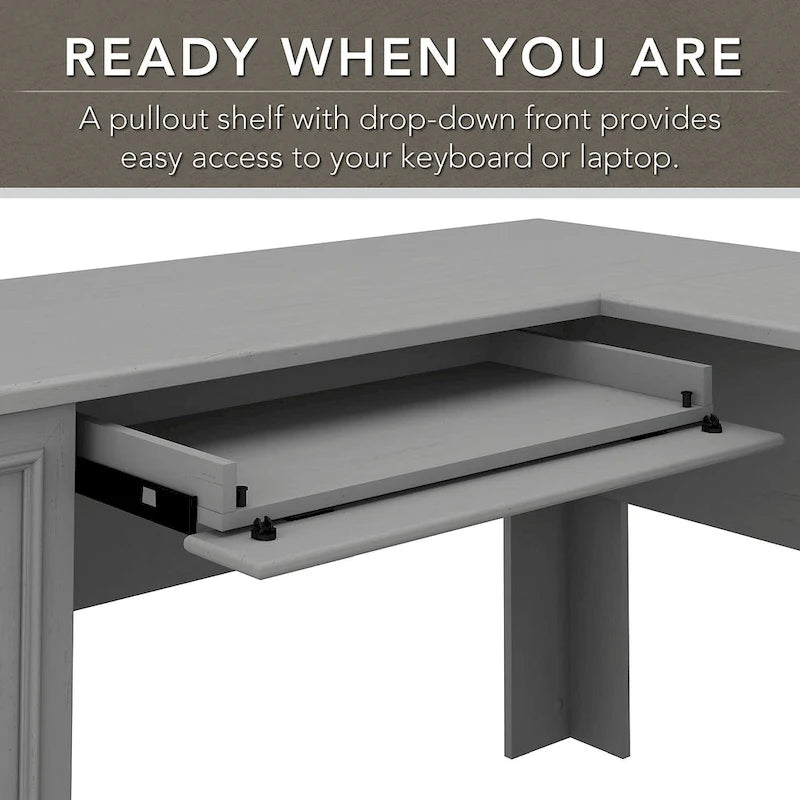 Apportez une touche de charme rustique moderne à votre bureau à domicile avec le bureau d'angle Fairview de Bush Furniture. Savourez votre café du matin, naviguez sur internet et gérez vos factures en toute tranquillité grâce à la surface de travail spacieuse et résistante de ce bureau d'angle. Rangez stylos, papier et chéquiers dans le tiroir et les compartiments ouverts, et organisez votre courrier dans le tiroir à dossiers format lettre. Un tiroir à façade rabattable pratique se transforme en plateau pour clavier ou en étagère pour ordinateur portable, libérant ainsi le bureau pour vos tâches quotidiennes. Le caisson de rangement vertical du bureau d'angle comprend une étagère réglable pour accueillir fournitures de bureau et matériel de différentes tailles. Des détails charmants et des ferrures en étain vieilli ajoutent du cachet à votre bureau. Fixez la étagère de 60 cm de large assortie (vendue séparément) de chaque côté du bureau d'angle pour optimiser le rangement et l'exposition de vos objets. Plusieurs finitions sont disponibles : noir antique avec accents cerisier Hansen, blanc antique avec accents érable thé ou gris Cape Cod. Ce bureau de style campagnard avec rangement est conforme aux normes de qualité ANSI/SOHO en matière de sécurité et de performance et bénéficie d'une garantie fabricant de 6 ans de Bush Furniture. Découvrez la collection Fairview complète pour trouver des articles assortis et créer un espace de travail ou de vie au style cottage décontracté.