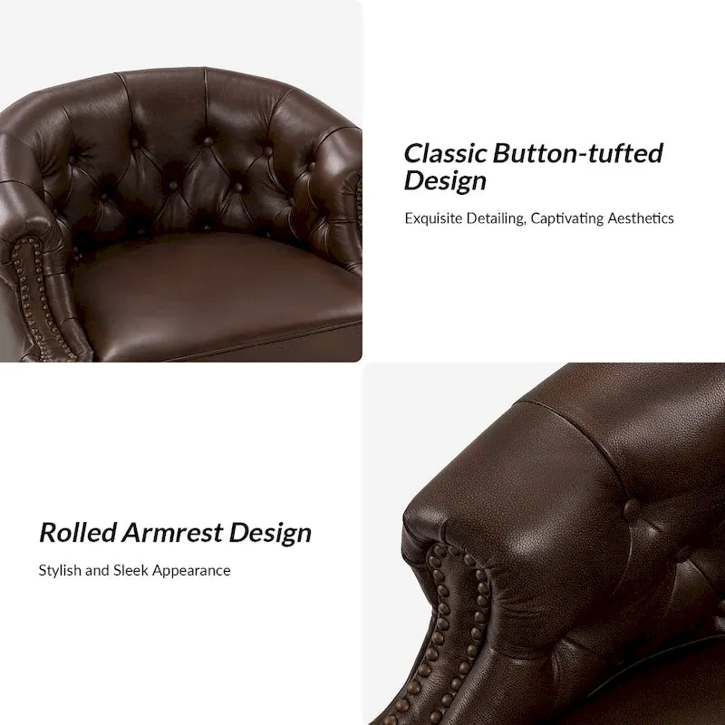 Cet ensemble de fauteuils pivotants est un meuble luxueux qui respire l'élégance et le style. Confectionné avec un souci du détail exceptionnel, il est doté d'une assise revêtue de cuir véritable, alliant durabilité et esthétique raffinée. Le dossier capitonné, évoquant le design classique Chesterfield, ajoute une touche de charme vintage et un attrait intemporel. Avec ses accoudoirs incurvés et encastrés, cet ensemble offre un confort optimal et une allure majestueuse. Les clous décoratifs qui ornent les accoudoirs et le piètement rehaussent son opulence, lui conférant un aspect raffiné et soigné. Pour une fonctionnalité accrue, l'ensemble pivote à 360°, offrant une grande liberté de mouvement. Cet ensemble de fauteuils pivotants combine avec brio luxe, confort et polyvalence, et s'intègre parfaitement à tout intérieur élégant.