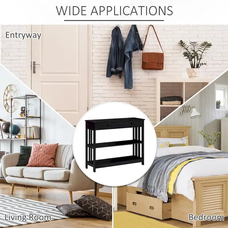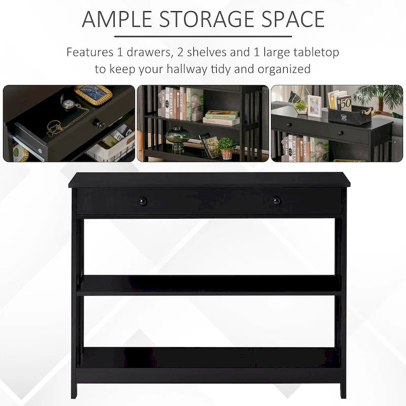 Vous vous demandez comment ranger vos clés, gants, chaussures et autres objets essentiels dans l'entrée ? Découvrez cette console HOMCOM, idéale pour votre canapé. Cette console d'entrée est dotée d'un tiroir spacieux pour vos effets personnels comme votre portefeuille et vos clés. Son large plateau et ses deux étagères ouvertes vous permettent de ranger et d'exposer photos, objets décoratifs et boîtes de rangement. Un dispositif anti-basculement assure une sécurité optimale. Sa finition noire et ses lignes épurées en font un atout charme pour votre salon, votre chambre ou votre entrée.