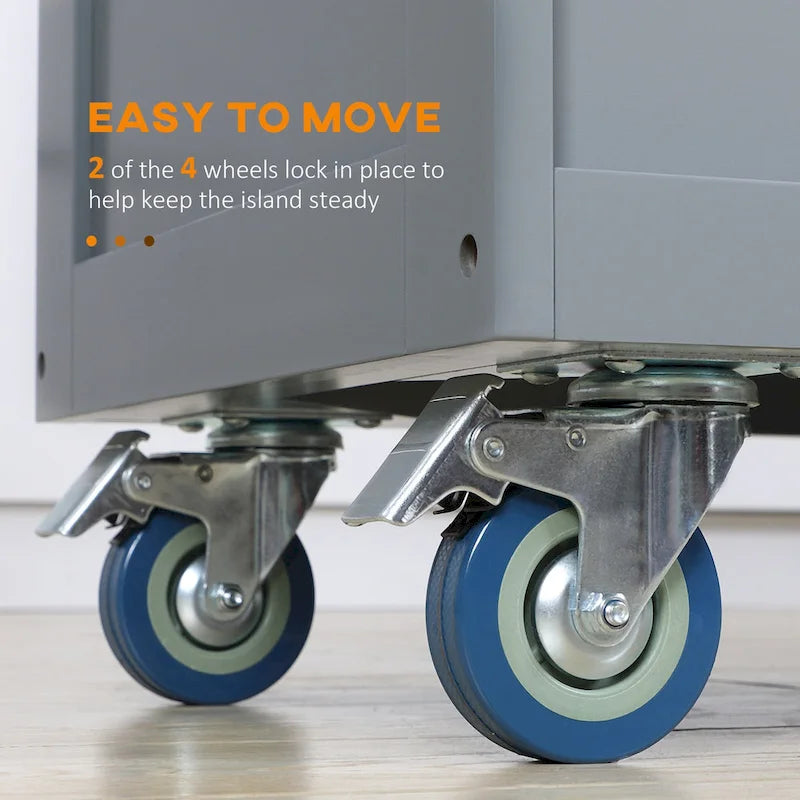 Laissez l'îlot de cuisine HOMCOM avec rangements vous faciliter la vie lors de vos réceptions et de la préparation des repas. Il offre de multiples options de rangement : un plan de travail en bois d'hévéa, deux grands tiroirs, deux placards, un porte-épices, un porte-couteaux et un porte-serviettes pour vos appareils électroménagers. Besoin de plus d'espace ? Déployez le plan de travail rabattable et repliez-le facilement pour optimiser l'espace de votre cuisine. Ses quatre roues, dont deux avec freins, permettent de le déplacer aisément d'une pièce à l'autre et assurent sa stabilité.