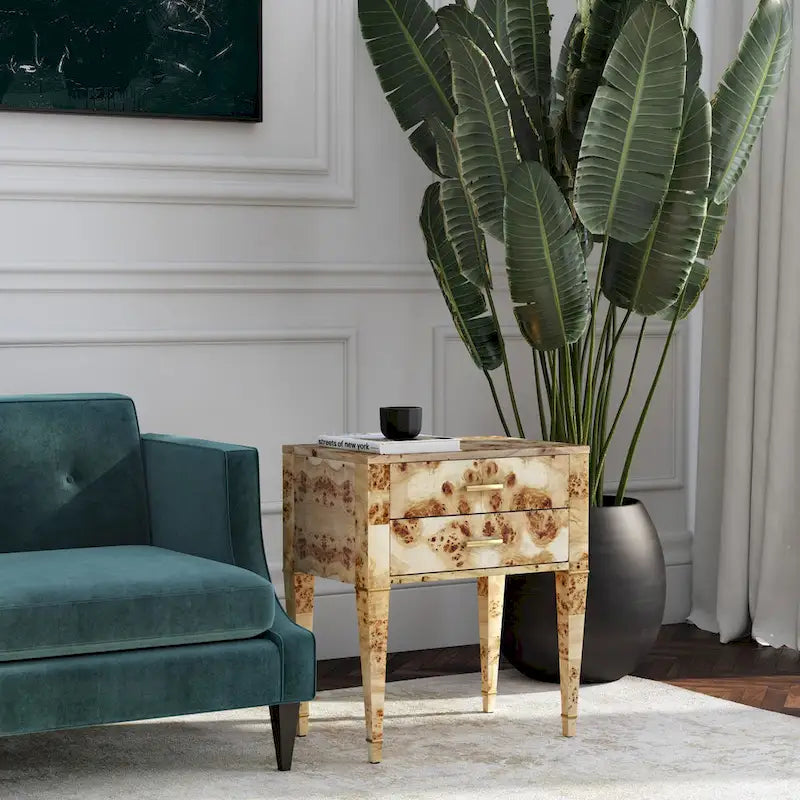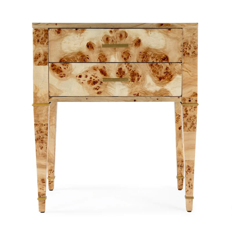 Avec ses magnifiques pieds carrés fuselés et ses détails dorés, ce meuble de style mid-century se modernise grâce à sa quincaillerie dorée assortie et sa luxueuse finition en loupe de bois. De par les caractéristiques naturelles du grain du bois de loupe, chaque pièce est unique, vous offrant ainsi un meuble qui semble avoir été créé sur mesure pour votre intérieur. Il dispose de deux tiroirs spacieux, parfaits pour ranger tous vos essentiels.