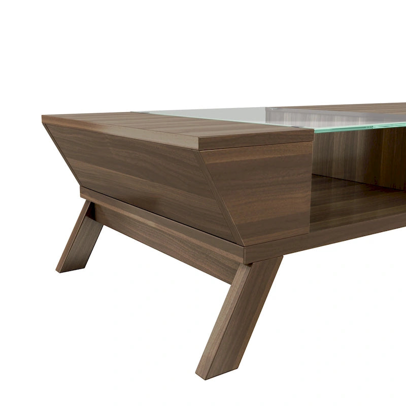 Table basse Kress Mid-Century Modern en noyer avec insert en verre de 119 cm (47 pouces) et une étagère, par Furniture of America