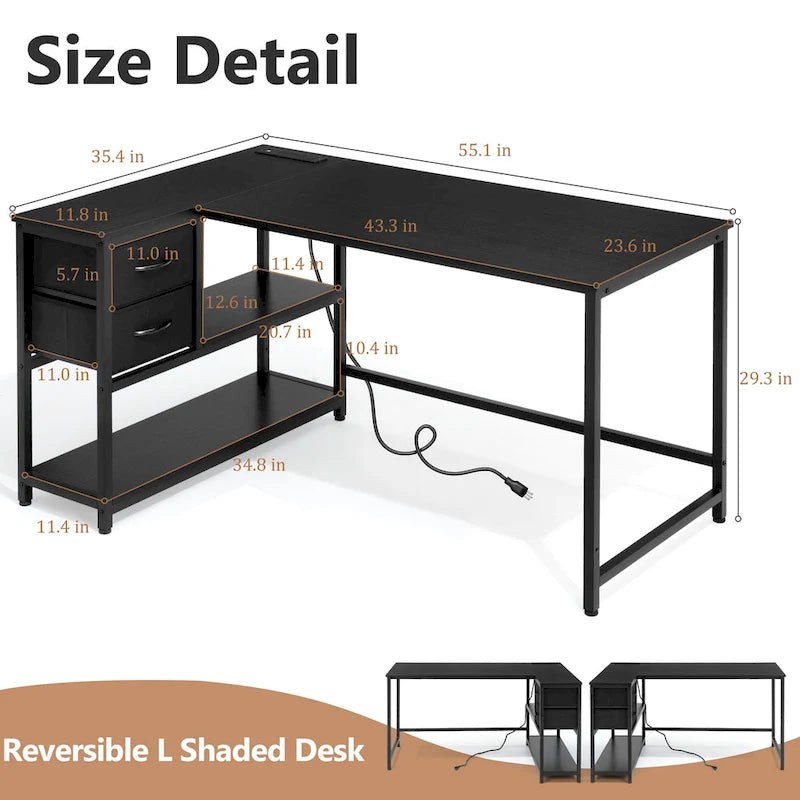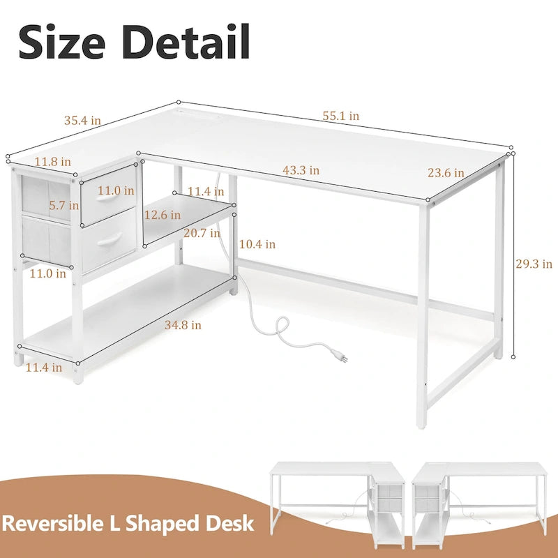 Bureau d'ordinateur en forme de L avec station de charge, bureau d'angle réversible avec tiroir