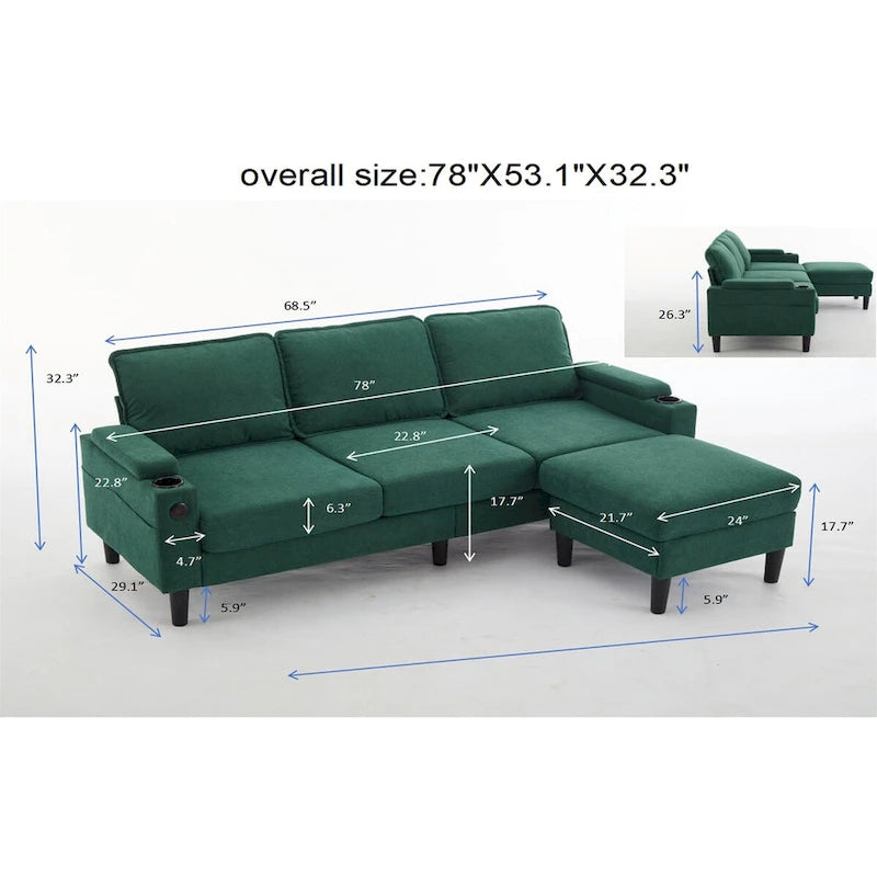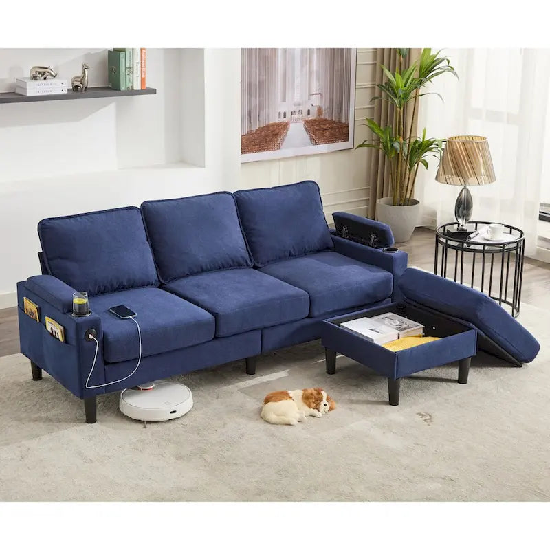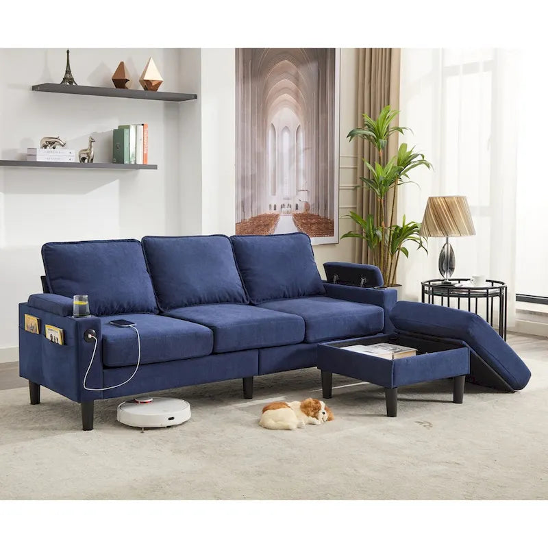 Canapé d'angle en tissu en forme de L avec pouf de rangement et port USB