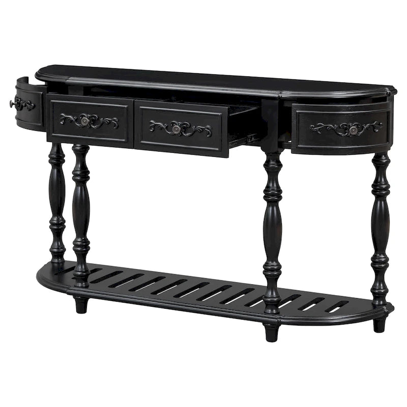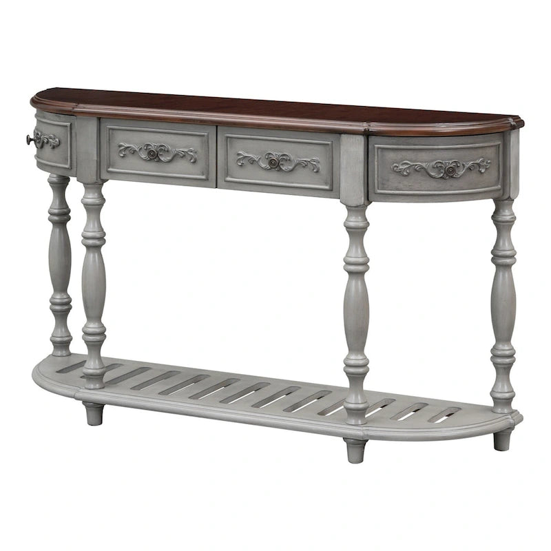 - Cette console demi-lune incurvée allie des détails uniques à une structure en bois classique, créant ainsi un style parfait pour votre salon ou votre entrée. Elle peut également sublimer votre couloir et y disposer fleurs, lampes ou rangements. Fabriquée en MDF et en bois massif, sa finition est très caractéristique. De plus, ses quatre tiroirs et son étagère ouverte vous permettront d'exposer un bocal de coquillages rapportés de voyage ou quelques albums photos de famille.