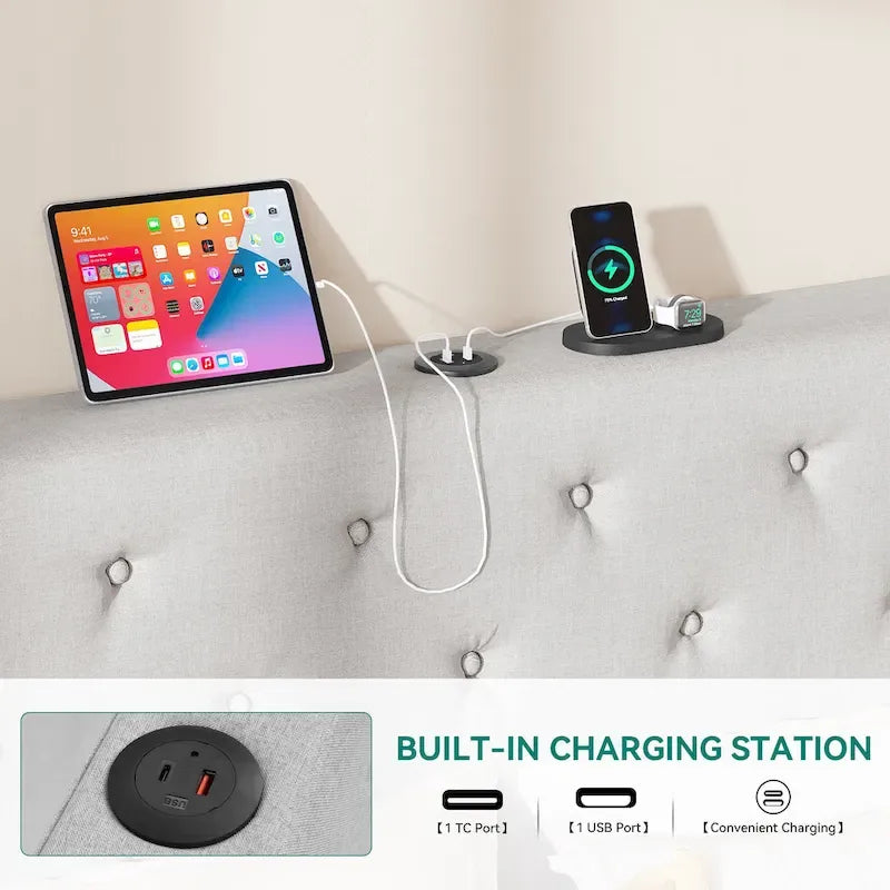 Lit plateforme Moasis Queen avec tête de lit rembourrée et rangement intégré