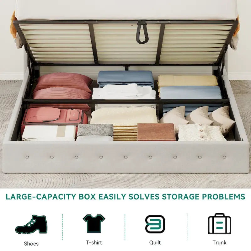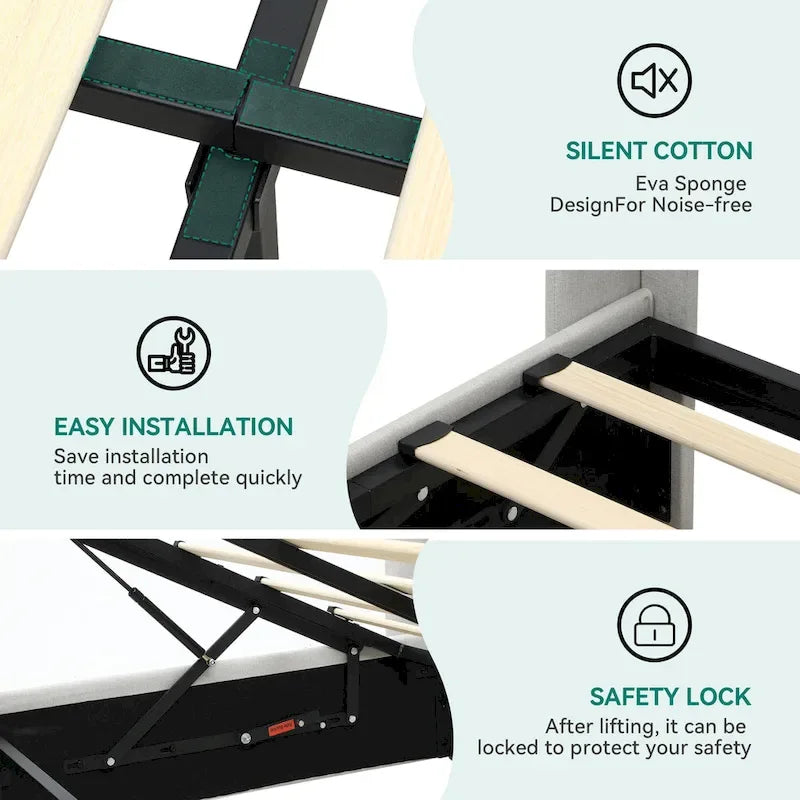 Ce magnifique lit plateforme capitonné est doté d'une tête de lit rembourrée qui apporte une touche contemporaine et élégante à votre chambre. Son rembourrage en mousse épaisse offre un confort optimal. Sa structure robuste en bois et son sommier à lattes garantissent stabilité et sécurité. Un système de rangement hydraulique sous le matelas permet de ranger vos affaires de chambre même dans les espaces réduits, sans compromettre la taille du lit.