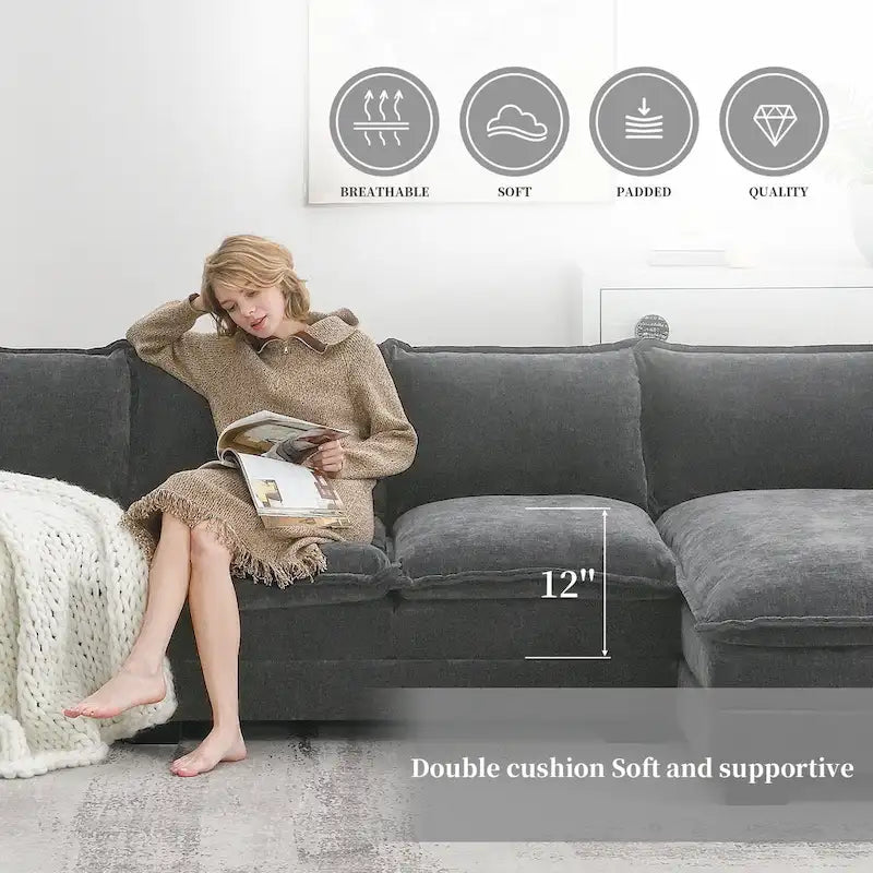 Ce canapé d'angle moderne arbore un design classique intemporel. Son revêtement et ses lignes épurées s'harmonisent parfaitement pour créer une esthétique raffinée qui s'intègre à tous les styles de décoration et sublime votre intérieur. Doté de coussins doubles pour un confort optimal, il offre un soutien accru et apporte une touche décorative à votre salon.