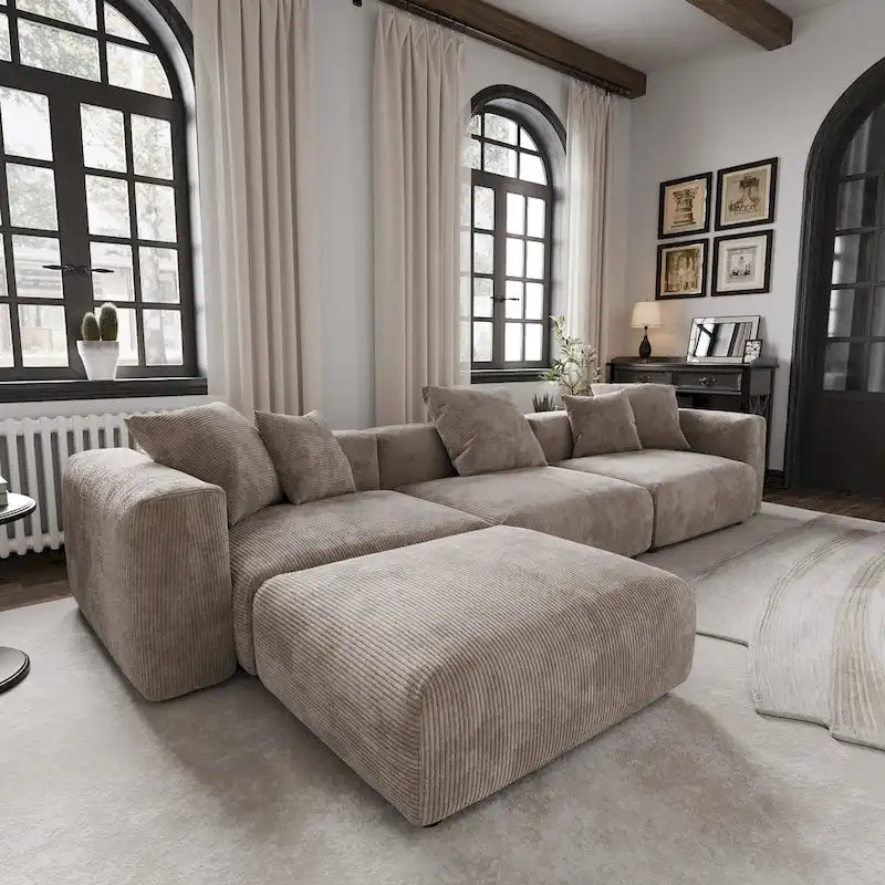 Canapé d'angle moderne avec 5 coussins, luxueux canapé d'angle modulable avec méridienne et pouf