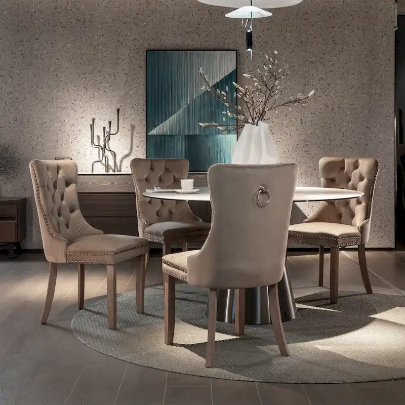 Ensemble moderne de 2 chaises de salle à manger capitonnées en velours, pieds en bois et garniture cloutée