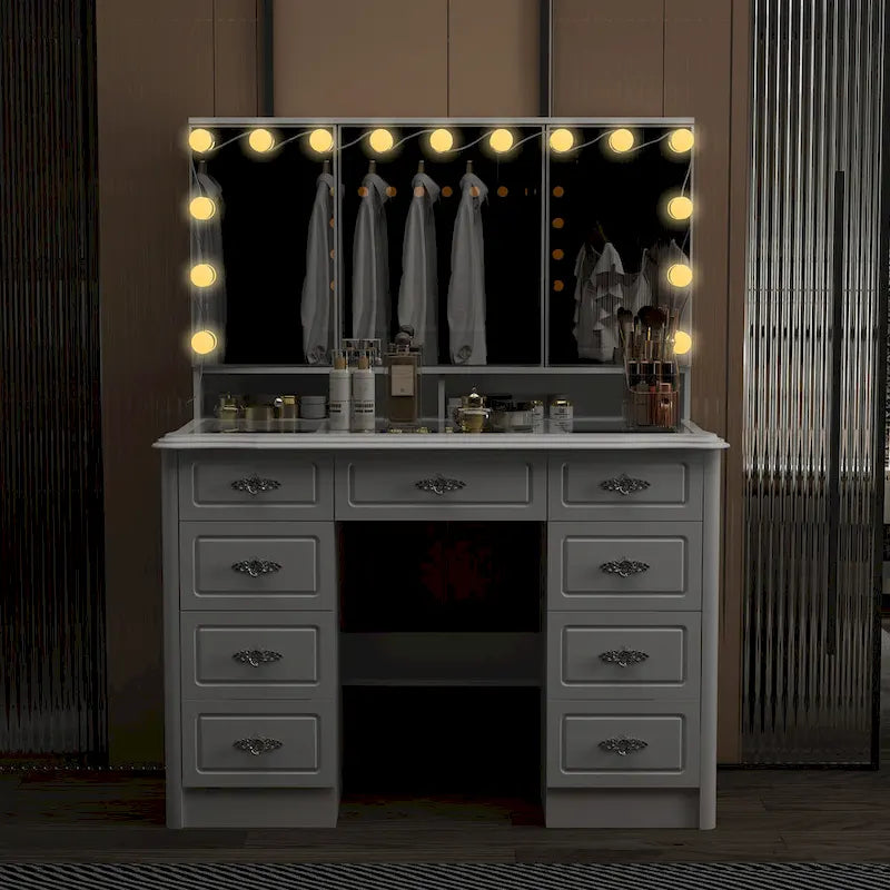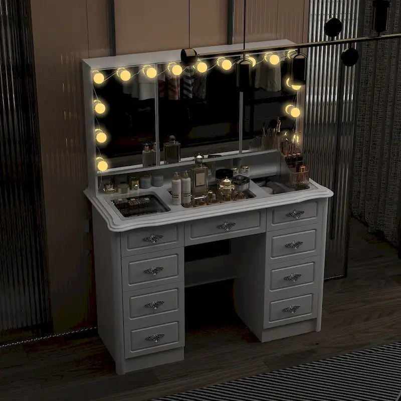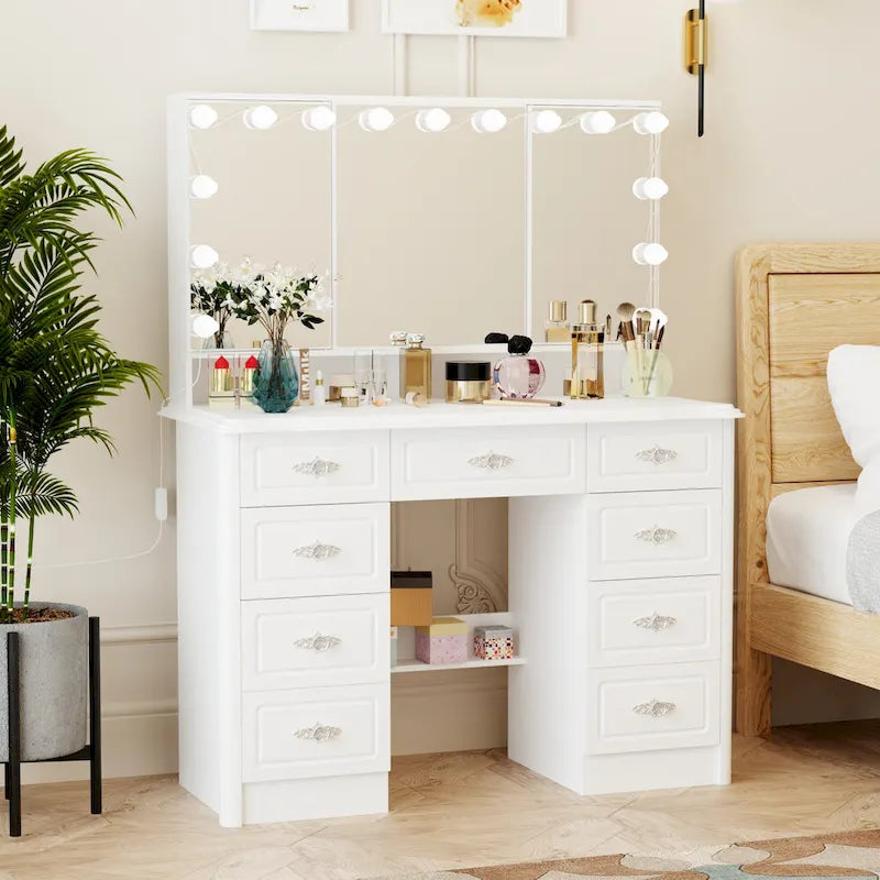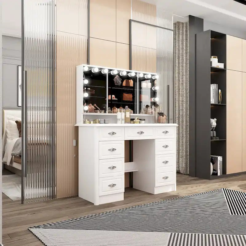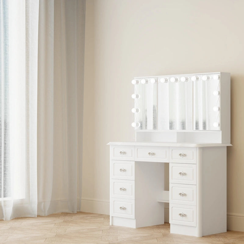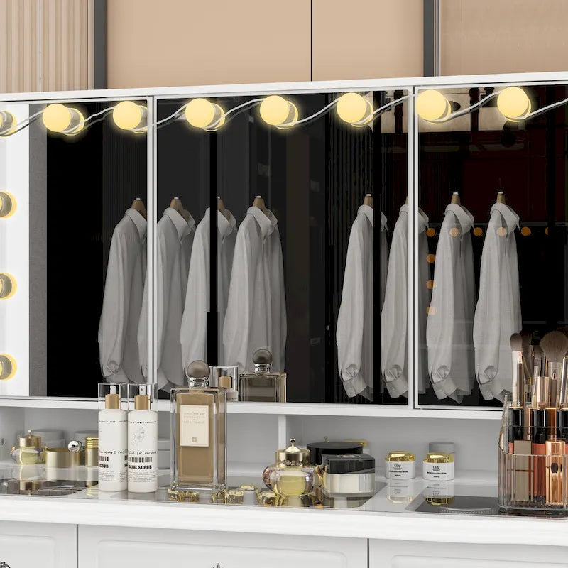 Élégante coiffeuse blanche avec miroir triptyque et éclairage réglable