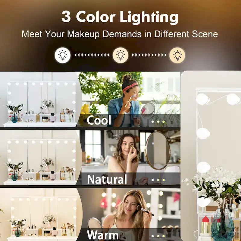 Miroir à trois volets : Profitez de la praticité d’un miroir à trois volets doté d’un anneau d’ampoules à trois couleurs (lumière chaude, lumière du jour, lumière froide). Illuminez votre coiffeuse grâce à un ensemble de 15 ampoules certifiées, d’une puissance de 0,5 W chacune. L’interface USB offre une grande facilité d’utilisation, sans nécessiter d’adaptateur secteur.