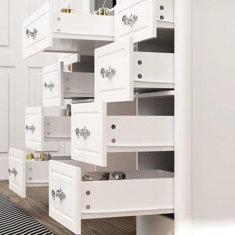 Conception des tiroirs : Les tiroirs sont équipés de glissières blanches silencieuses de 14 pouces à montage inférieur pour un fonctionnement fluide et silencieux.