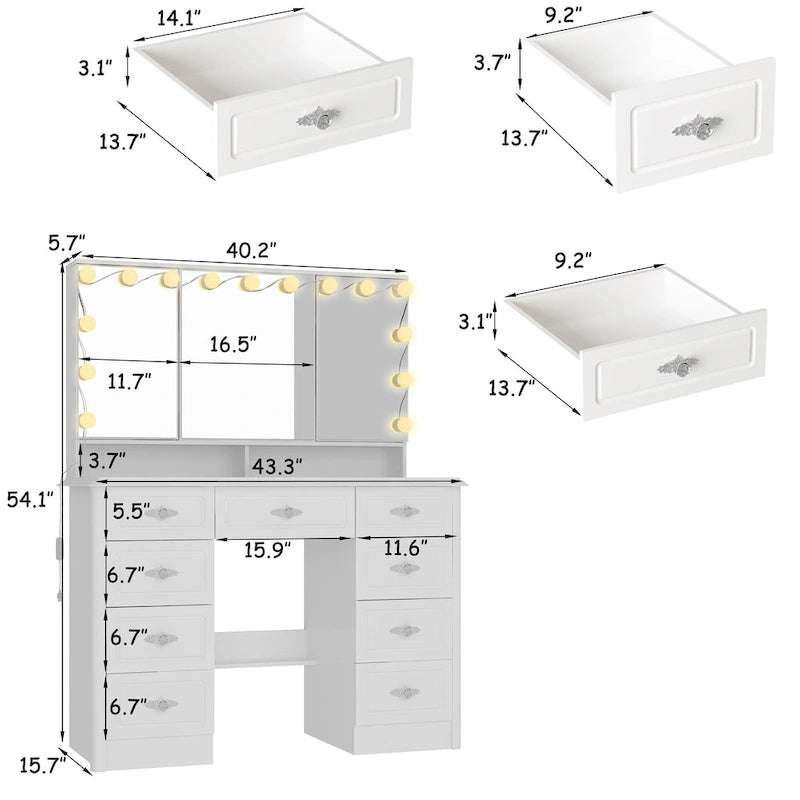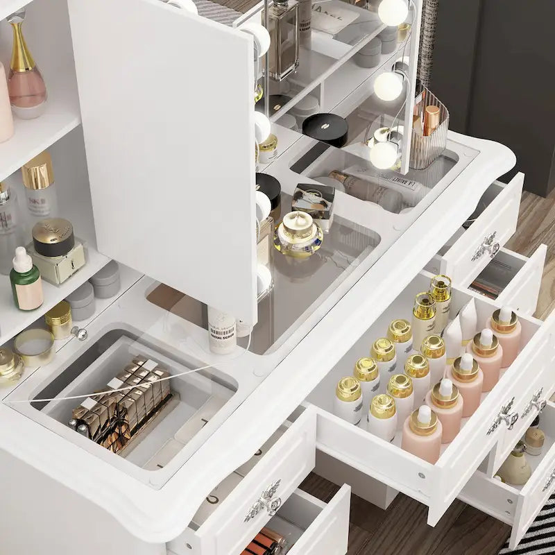 Transformez votre espace beauté avec cette coiffeuse au design soigné. Sa palette de blanc immaculé évoque la pureté, tandis que ses accents argentés et or rose apportent une touche de glamour. Le miroir triptyque, doté d'un éclairage réglable, fait de votre routine beauté un véritable moment de détente. Son design ingénieux, avec ses tiroirs silencieux et sa prise USB, fait de cette coiffeuse un meuble à la fois pratique et élégant.