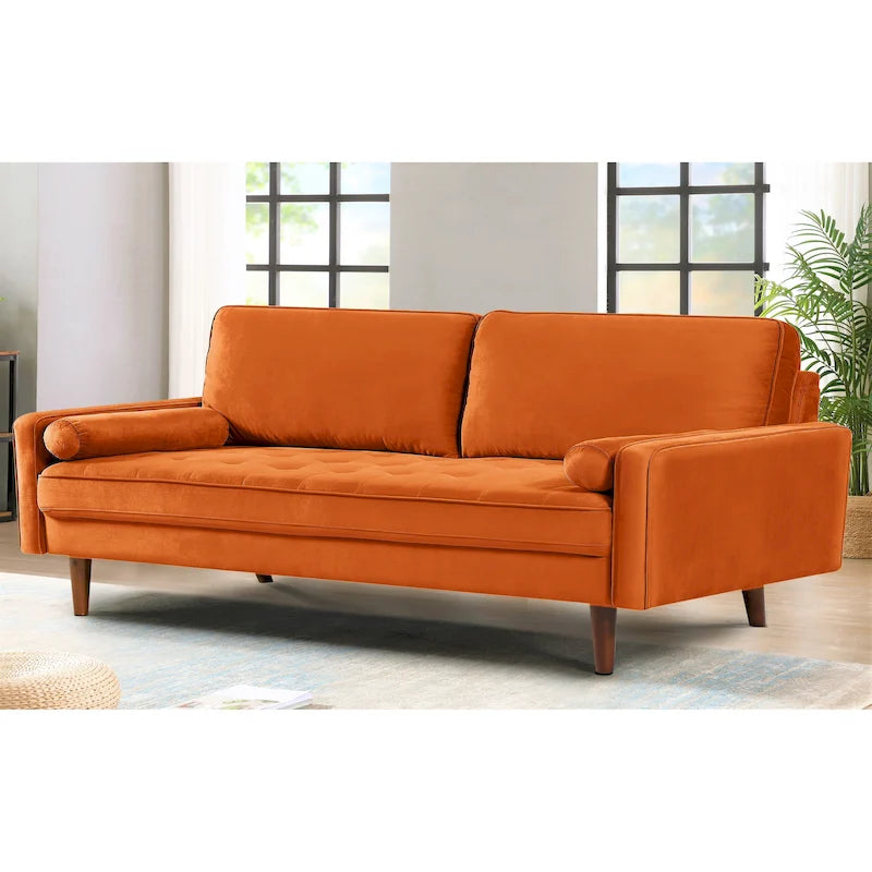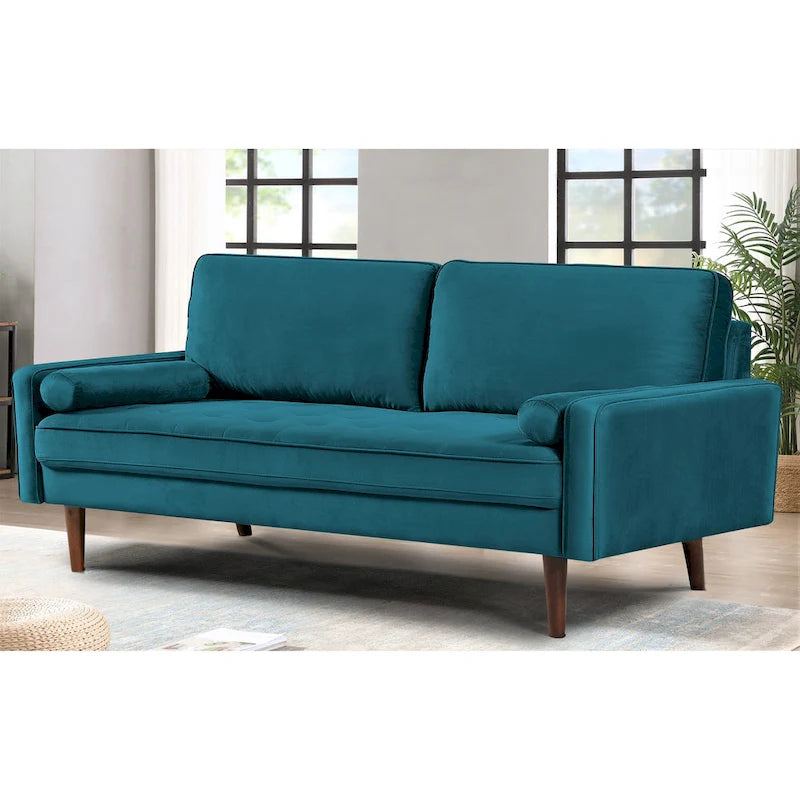 Le design classique de ce canapé, inspiré du style Mid-century, lui confère une allure unique avec sa structure en bois et son revêtement en velours capitonné. Ses détails capitonnés apportent une touche raffinée à tout espace, tandis que sa silhouette épurée et ses accoudoirs carrés lui confèrent un style résolument moderne. Il est doté d'une assise et d'un dossier capitonnés, ainsi que de pieds en bois. Deux coussins cylindriques sont inclus. Dimensions du canapé : 70 x 31,5 x 33,07 cm