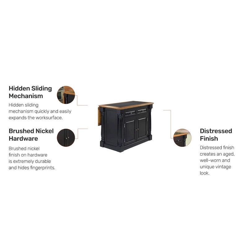 Apportez style et fonctionnalité à votre cuisine avec l'îlot central Monarch en chêne noir. Son plateau en bois massif, orné d'une incrustation de granit et d'un placage en chêne vieilli, confère élégance et robustesse à votre espace. Le plateau rabattable s'étend et se replie pour offrir un plan de travail supplémentaire ou des places assises selon vos besoins, tandis que les étagères réglables accueillent tous vos ustensiles et accessoires de cuisine. Avec sa quincaillerie en nickel brossé, cet îlot est un atout aussi esthétique que pratique pour toute cuisine.