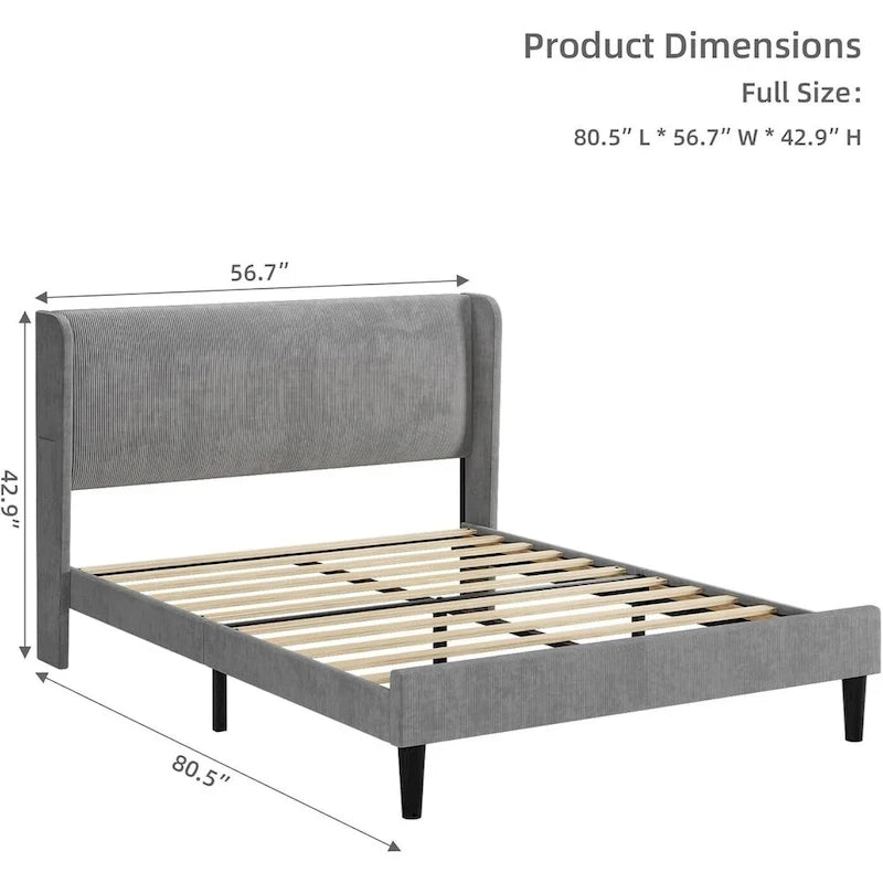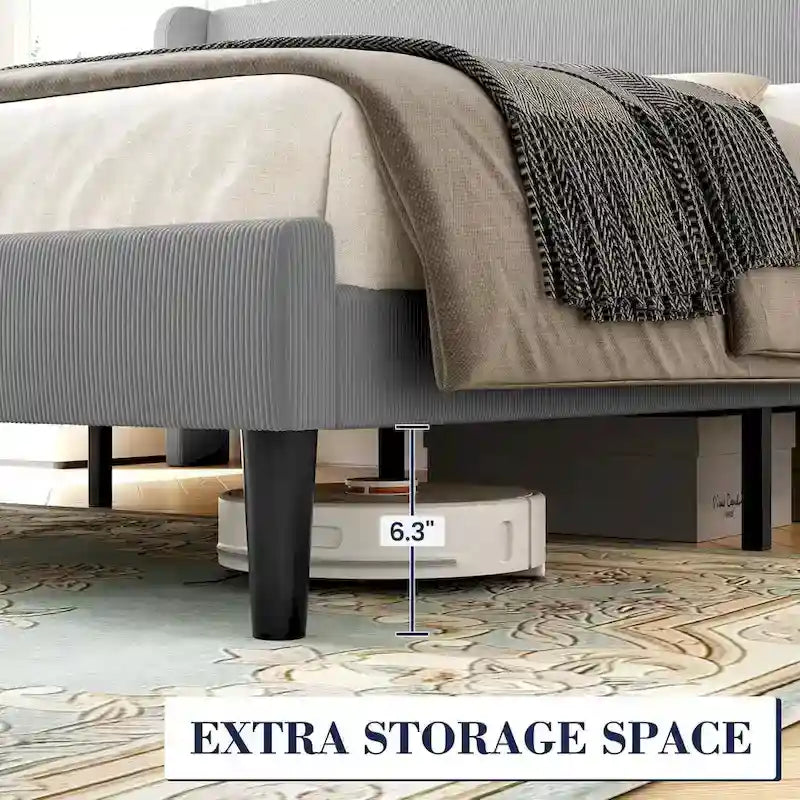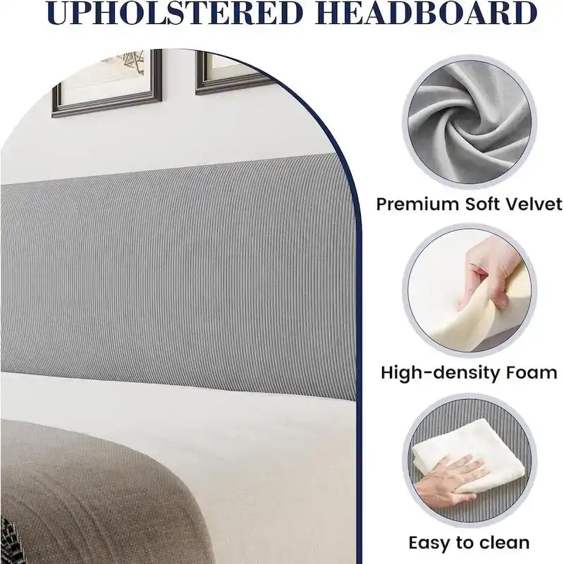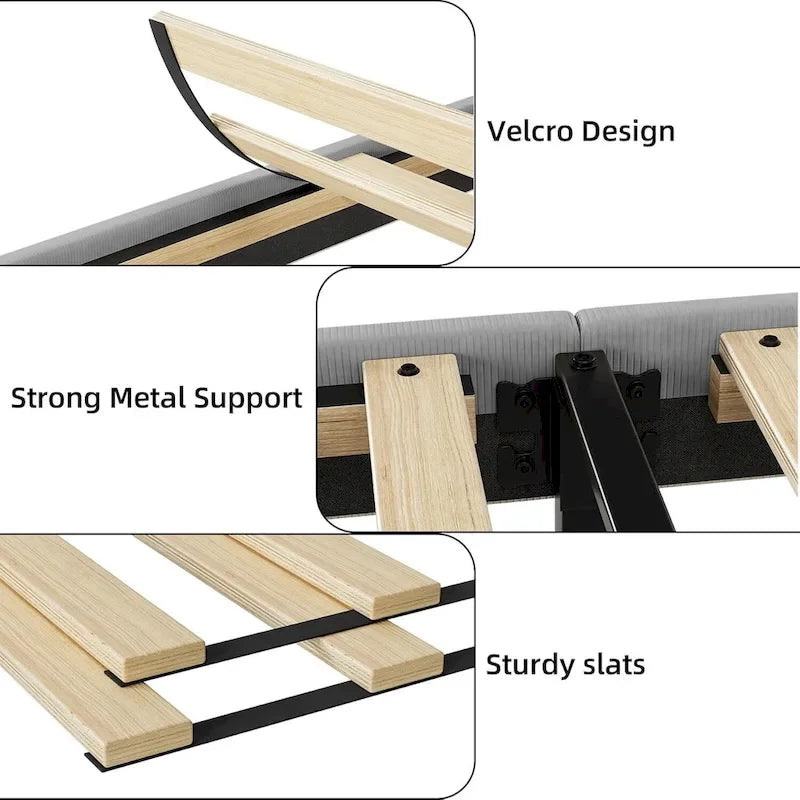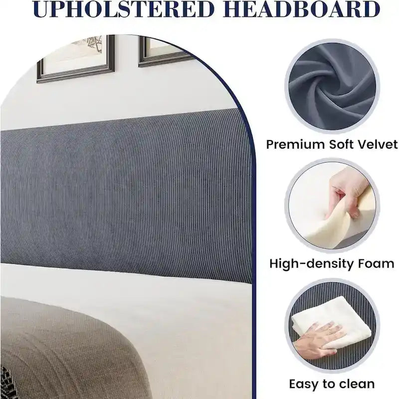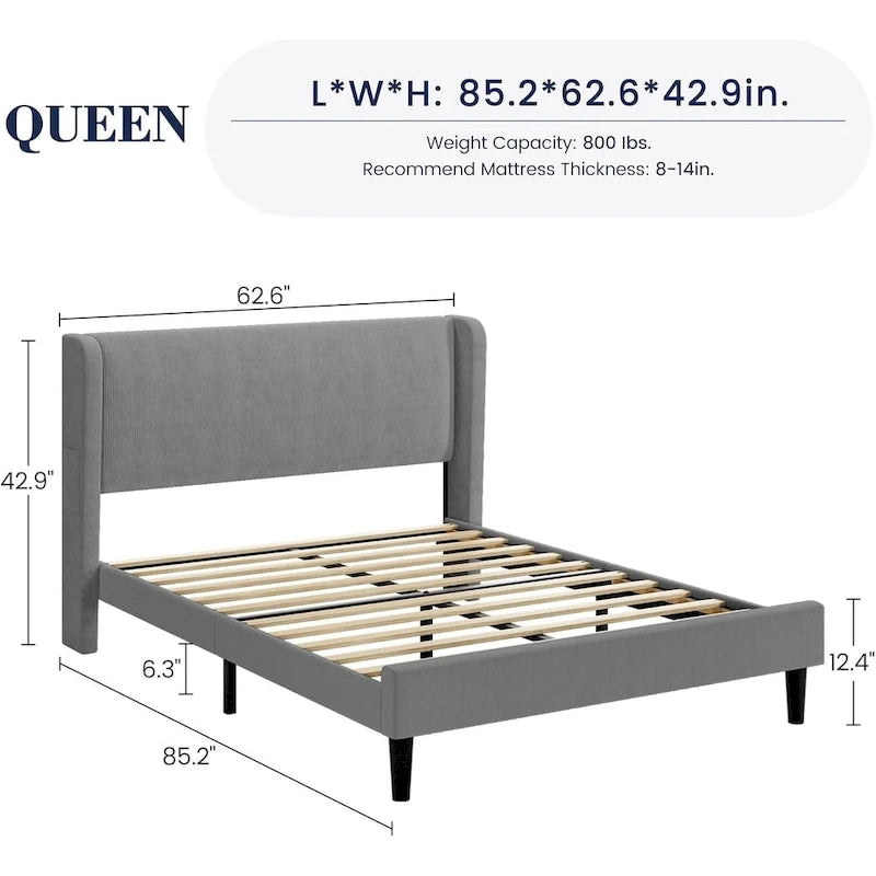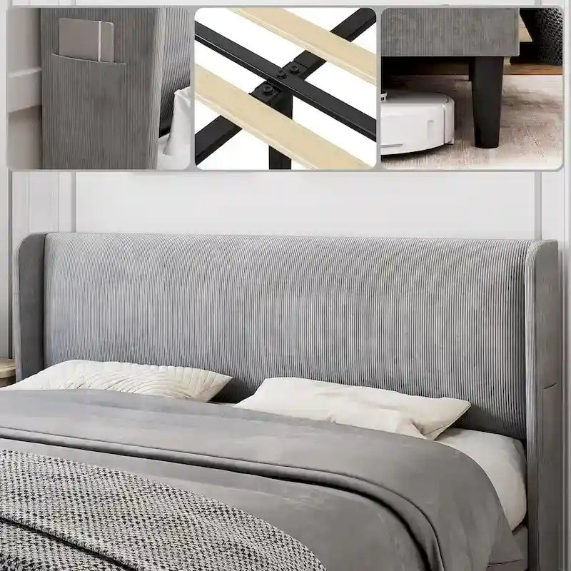 Design à oreilles : Ce cadre de lit arbore un design élégant à oreilles qui empêche le matelas de glisser. Recouvert de velours luxueux et de mousse moelleuse, il offre un excellent soutien pour le dos et la nuque, garantissant un confort optimal. Espace de rangement : Le cadre de lit queen size offre un grand espace de rangement sous le lit pour vos affaires. La tête de lit à oreilles comprend également deux poches pour votre téléphone, vous aidant ainsi à garder votre espace bien organisé. Robuste et stable : La structure métallique robuste de ce lit queen size offre un soutien solide, renforcé par un pied de soutien central et des lattes en bois de qualité, assurant une base fiable pour votre matelas. Un sommeil paisible : Le sommier à lattes est recouvert de mousse EVA pour un environnement stable et silencieux. Les lattes sont solidement fixées pour éviter les frottements, vous permettant ainsi de dormir sans être dérangé. Installation facile : Tous les composants de ce lit queen size sont clairement étiquetés dans un seul carton. Suivez simplement les instructions fournies pour un assemblage rapide et facile, et profitez immédiatement de votre nouveau cadre de lit.
