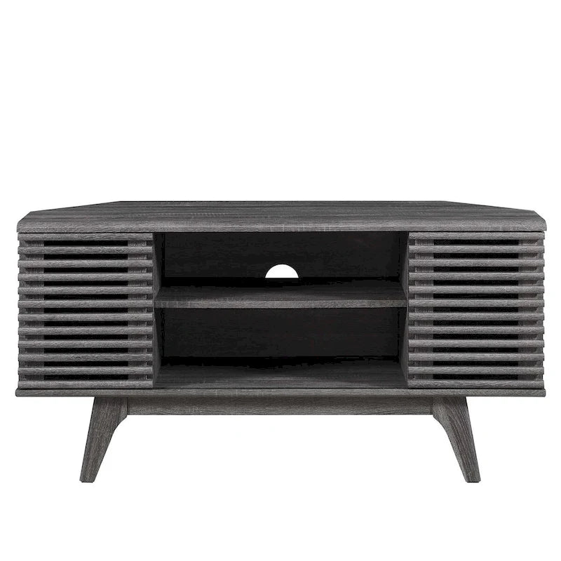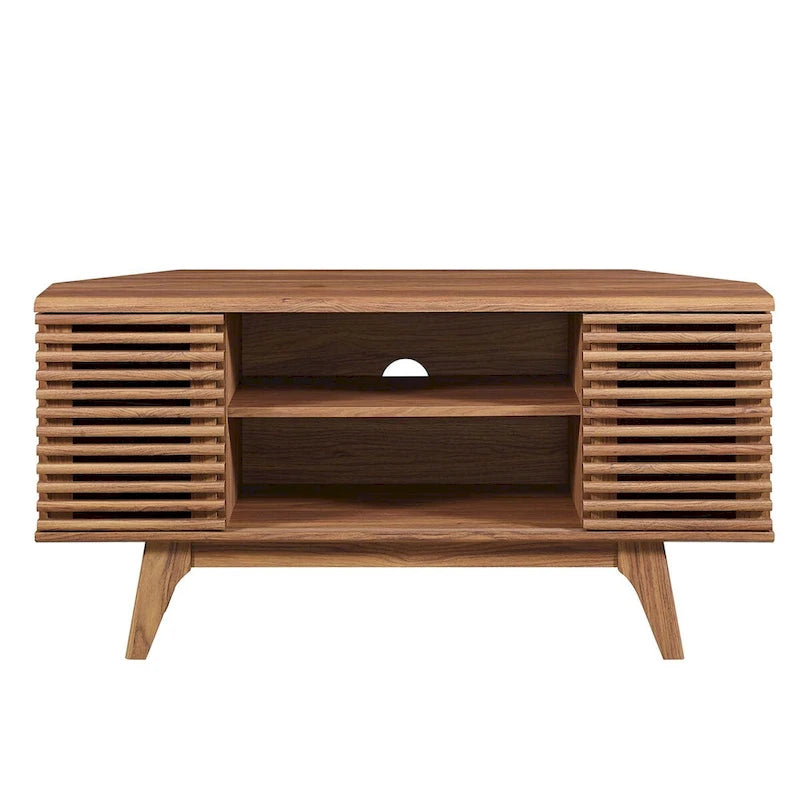 Apportez une touche d'élégance à votre salon, votre salle de détente ou votre espace de loisirs avec le meuble TV d'angle Render 46. Ce meuble TV de style mid-century est doté d'un placage en noyer lisse et de quatre pieds fuselés en bois massif avec des patins en mousse non marquants qui protègent vos sols. Les étagères réglables et les deux portes coulissantes à lattes offrent un espace de rangement généreux pour vos appareils multimédias. Grâce à son passe-câbles, le style linéaire contemporain du meuble Render permet une organisation optimale de vos câbles et peut accueillir des téléviseurs jusqu'à 50 pouces. Montage requis.