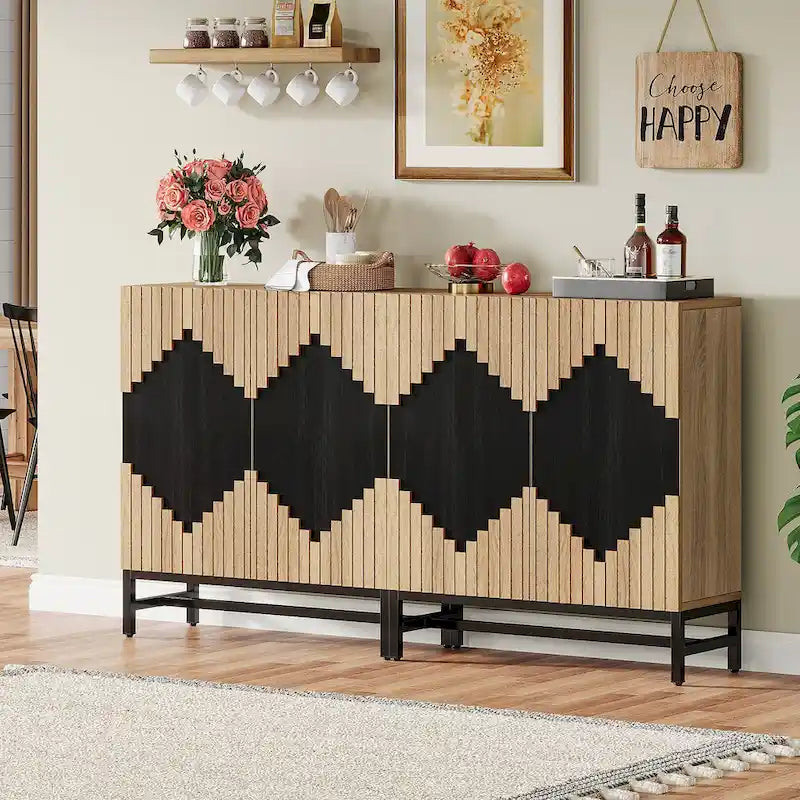 Ce buffet classique allie harmonieusement le charme rustique et le design moderne pour une esthétique incomparable, mise en valeur par une porte bicolore à motif géométrique. Doté de quatre étagères, il offre un espace de rangement généreux, idéal pour divers objets, optimisant ainsi l'espace. Ce meuble polyvalent se transforme avec élégance en buffet, meuble de rangement, coin café ou meuble TV, et trouvera sa place dans n'importe quelle pièce.