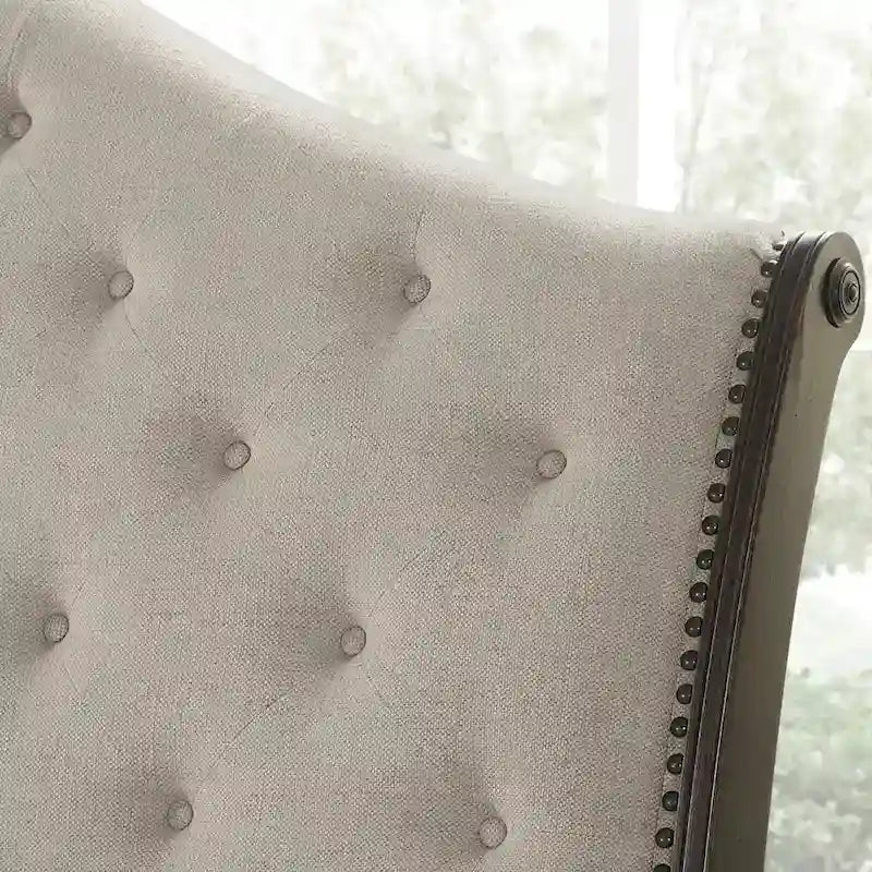 Ce magnifique lit traîneau capitonné, revêtu d'un tissu polyester beige et fini avec une riche teinte mélasse rehaussée d'un effet patiné, arbore un style traditionnel et raffiné. La tête et le pied de lit, aux volutes élégantes, sont capitonnés et ornés de clous décoratifs en laiton vieilli. De superbes pieds tournés et des moulures stylées ajoutent une touche d'élégance. Disponible en format king ou queen.