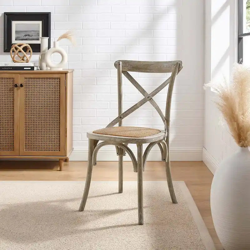 Apportez une touche rustique et chaleureuse à vos repas avec la chaise de salle à manger Windy Poplars de Gray Barn. Sa structure en bois d'orme traité est dotée d'une assise en rotin naturel et d'un dossier croisé aux courbes élégantes. Disponible en plusieurs coloris, elle s'harmonisera parfaitement avec votre ensemble de salle à manger. Ses embouts protègent votre sol.