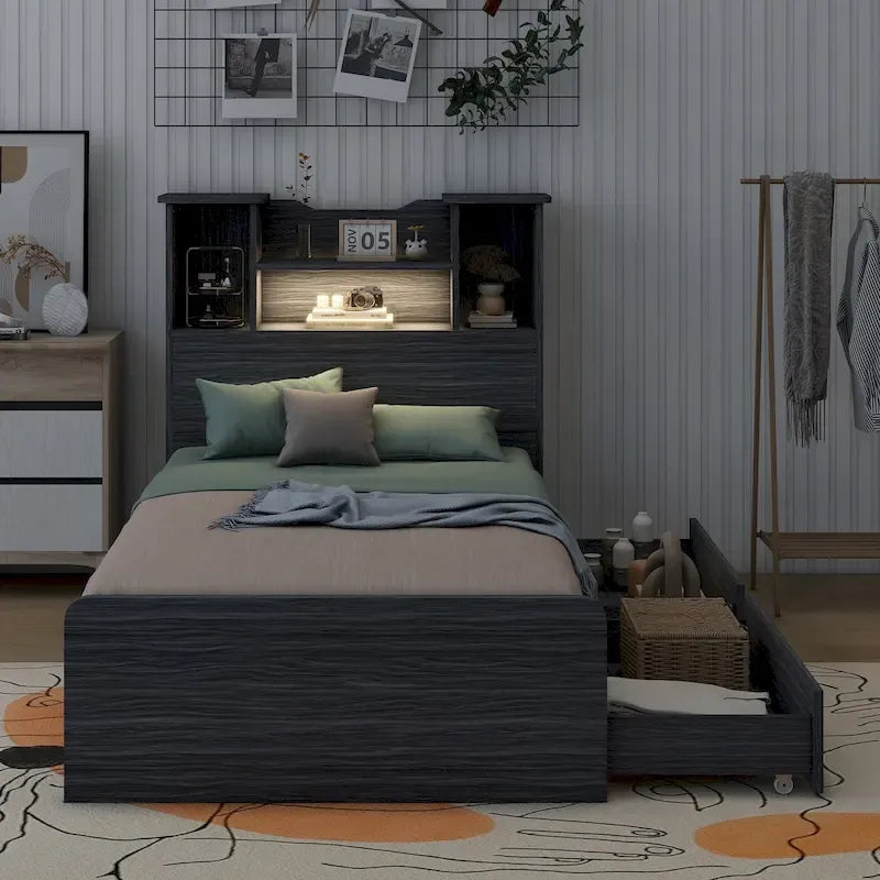 Lit plateforme avec étagère et tiroirs, format simple, rangement ouvert et éclairage LED