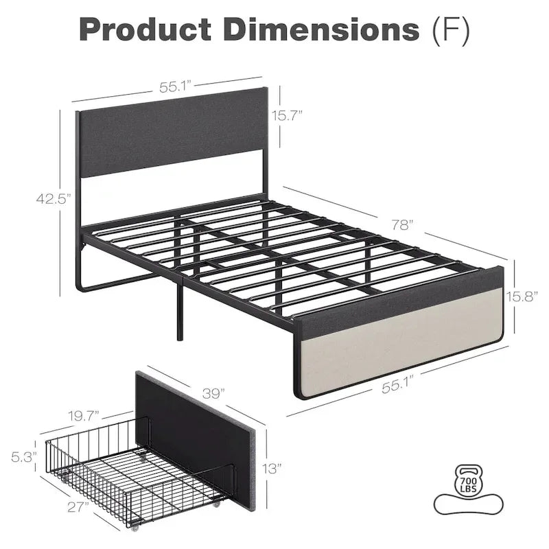 Cadre de lit plateforme rembourré avec 2 tiroirs de rangement