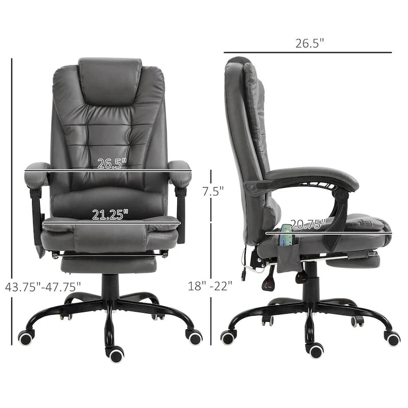 Installez-vous confortablement, détendez-vous et laissez le fauteuil de massage vibrant Vinsetto faire le reste. Ce fauteuil de bureau est équipé de 7 points de vibration répartis le long du dossier et de l'assise, pour soulager les douleurs dorsales tout au long de la journée. Une télécommande filaire permet de contrôler les moteurs et une poche latérale est prévue pour le rangement. La hauteur réglable, l'inclinaison du dossier et le repose-pieds rétractable vous offrent un confort personnalisé. Le soutien lombaire et les accoudoirs, l'assise et l'appui-tête rembourrés vous garantissent une relaxation optimale pour les longues journées de travail. Optimisez votre productivité tout en soulageant vos douleurs dorsales grâce à ce fauteuil de bureau massant Vinsetto.