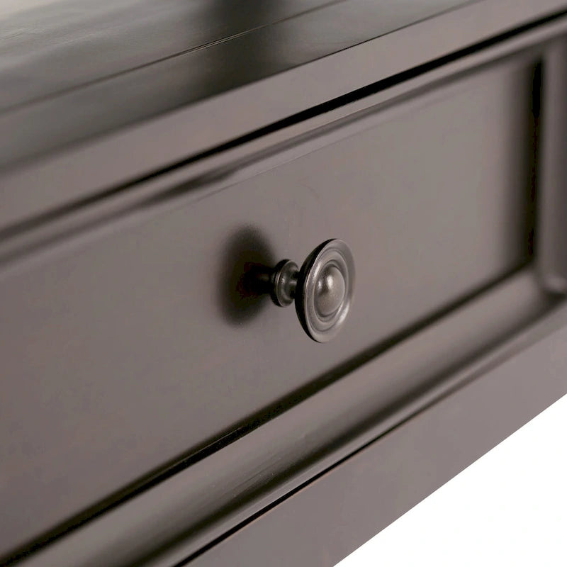 - Le style transitionnel comprend des pieds élégamment fuselés, un plateau de table à bordure moulurée, des façades de tiroirs encadrées de panneaux, des glissières de tiroir en métal et des boutons décoratifs ronds en étain antique.